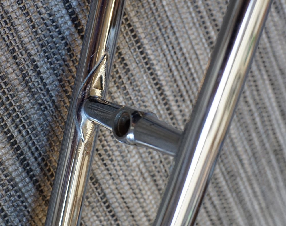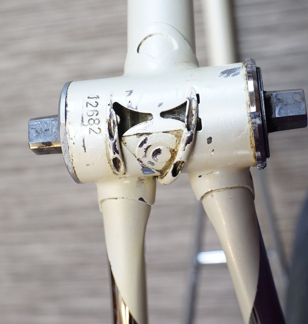Der Rahmen müßte ca. von 81-82 sein, Decals gab es keine mehr, die Lackierung ist Perlmut, sehr ähnlich der Peugeot Lackierung zu der Zeit. Die Muffen und die Gabelkronen sind Rot liniert bzw. gefüllt. Der Lack ist noch ganz gut, ich werde den Rahmen noch polieren, aber die Macken so lassen wie sie sind, da kein Rost in Sicht ist.