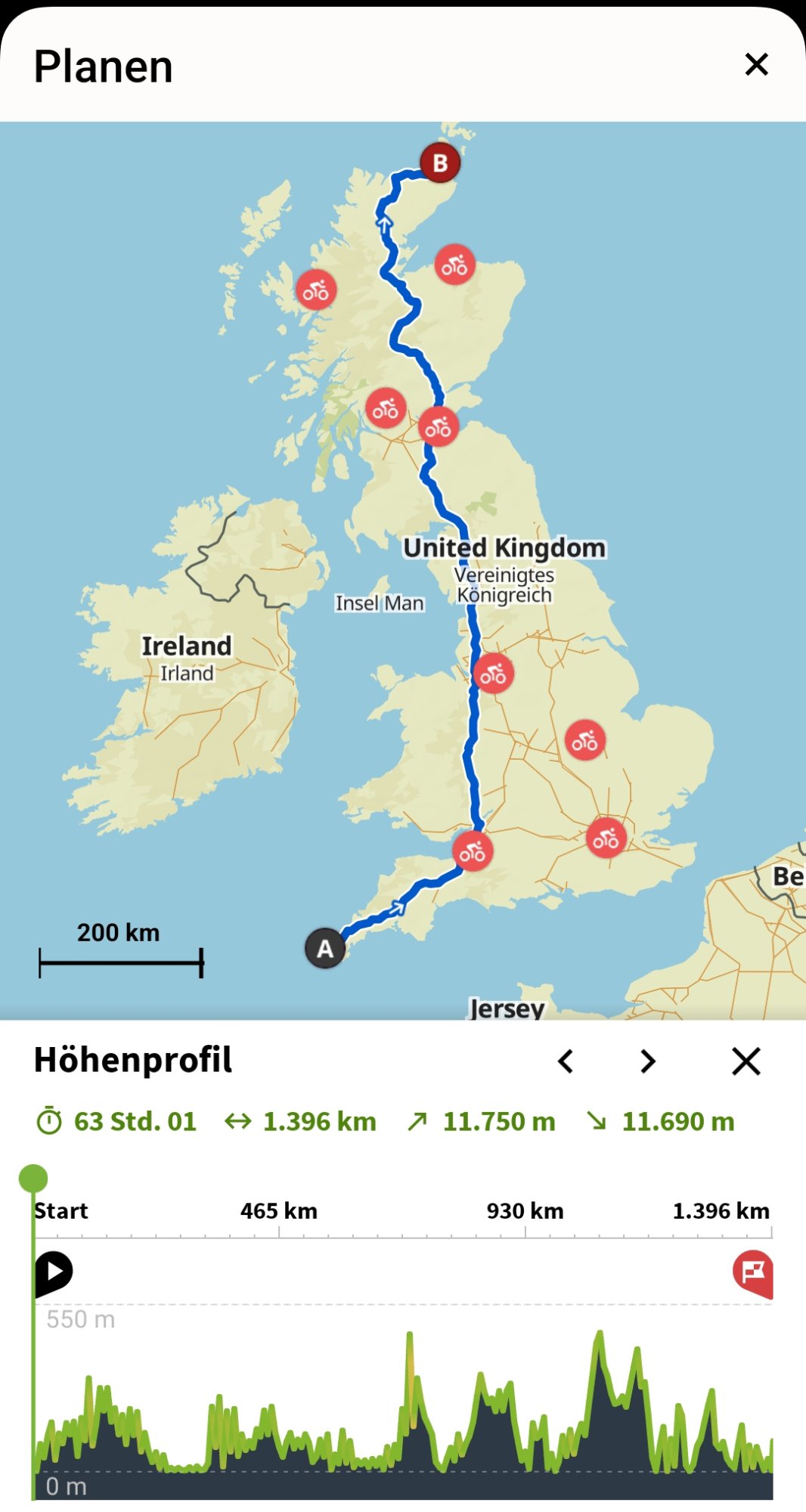 Meiner Meinung nach sollten das wesentlich mehr Hm sein. In Britain verlaufen Landstraßen selbst im flachen Terrain eher wellig, so daß sich die Hm zügig summieren. In den hügeligeren Gegenden in Nordenland kann man mit 2000Hm auf 100km rechnen, wenn man von den A-roads weggeht und sich auf die engen asphaltierten Pisten mit den fiesen climbs einläßt.Ziemlich wenig, hatte sehr viel mehr erwartet. Aber viermal jeweils 15h fahren und dreimal 6h Schlaf zwischendurch... Nur 8.000Hm auf 1.4xxkm, 25km/h im Schnitt. Mit passender Windrichtung würde ein Ultracyclist müde drüber lächeln. tss, 350km/Tag und dann noch soviel Schlaf, tss
