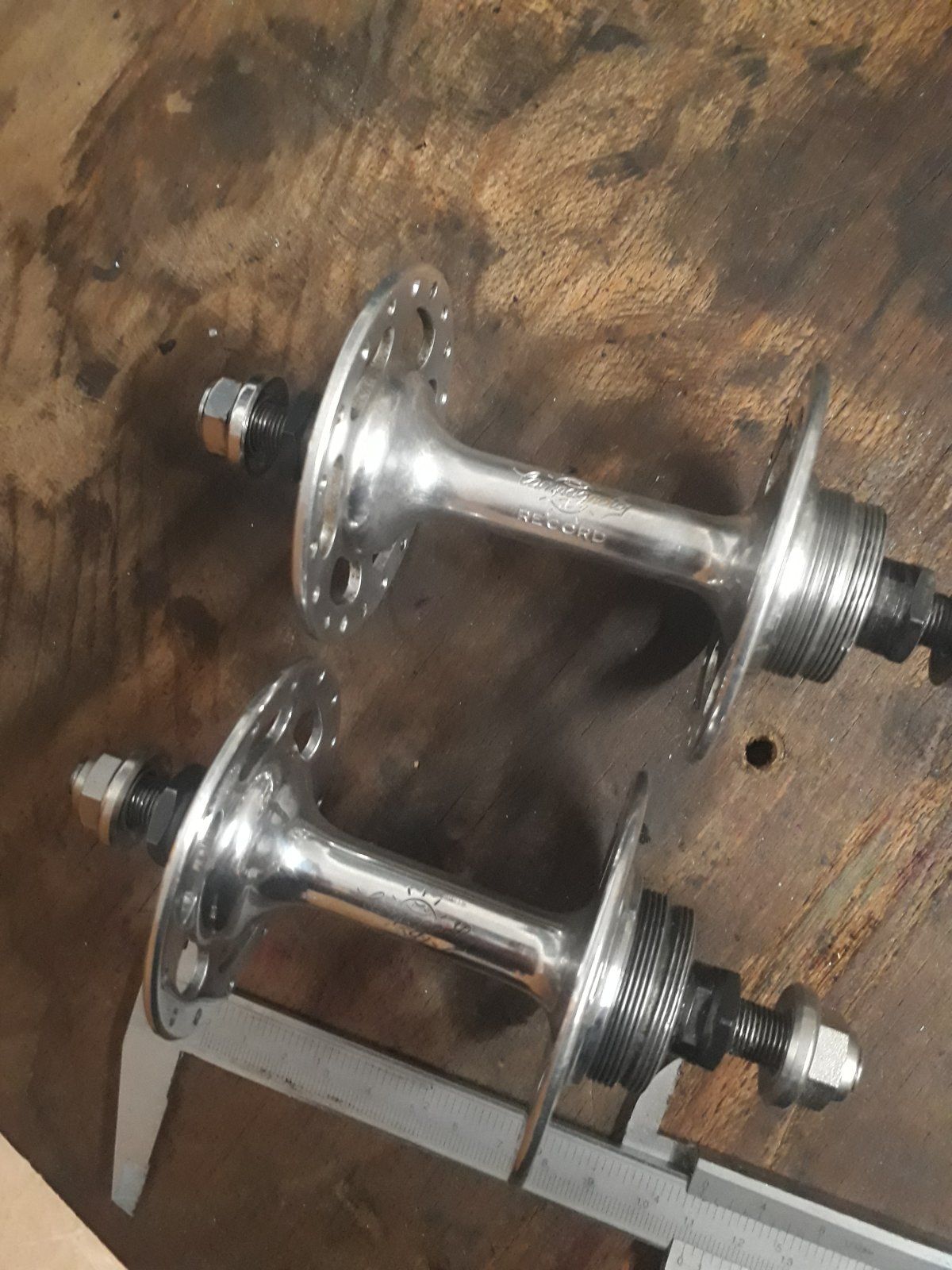 Campagnolo Record Pista Naben würde ich sagen. Eine Möglichkeit wären Campagnolo Record Strada Naben, deren Oelerclip entfernt wurde. Das entstandene Loch wurde mit den Brügelmann-Weltmeisterstreifen verschlossen. Habe ich schon öfter gesehen, bzw. ist auch in meinem Besitz. Ich hoffe das hilft dir.