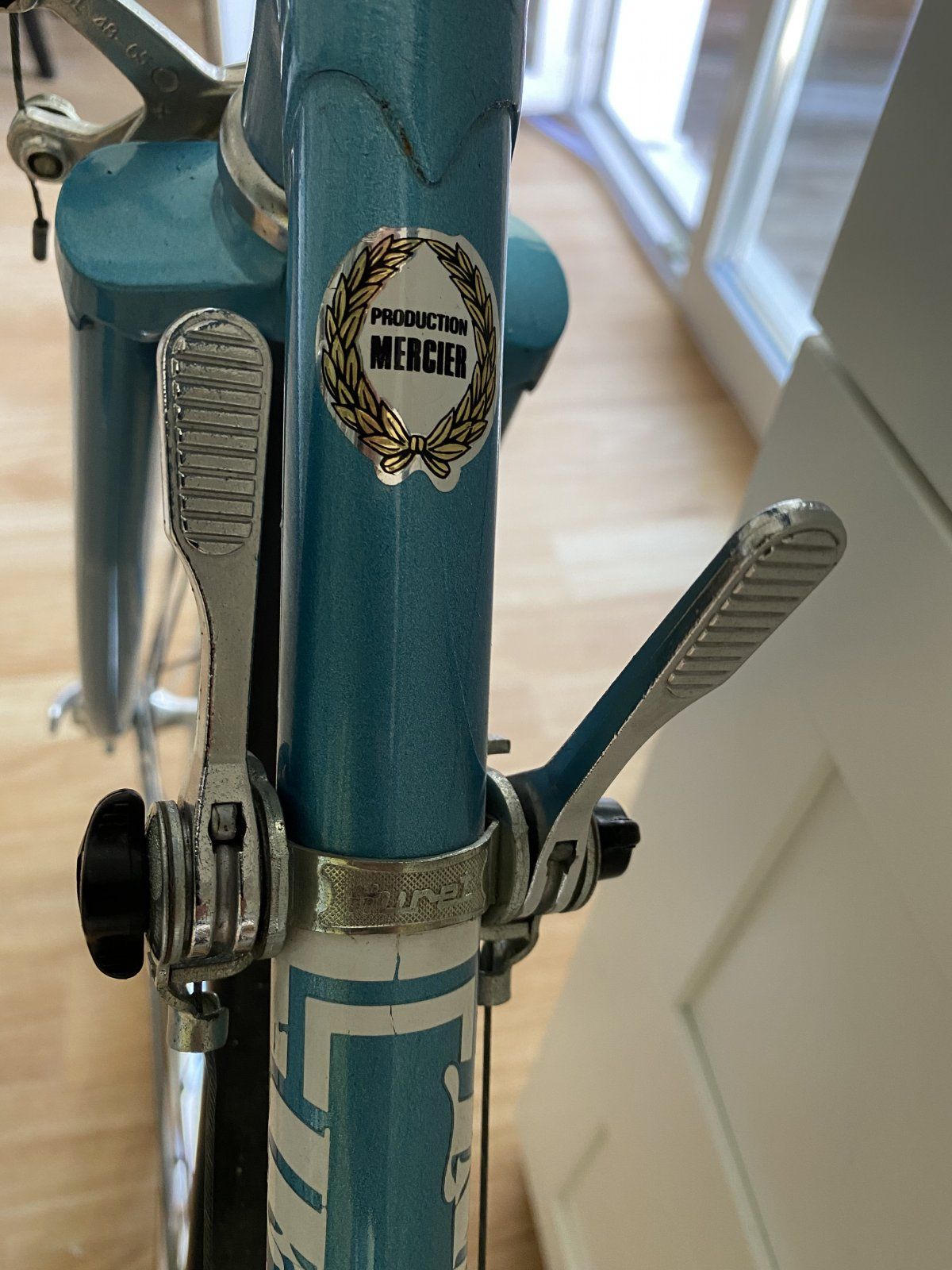 Auf dem Gabelkopf ist kein Mercier eingraviert. Aber ja ist ein wunderschönes Rad, hab mich auch sofort verliebt und musste es unbedingt haben. Bin sogar extra von Dresden nach Berlin gefahren um es abzuholen. Und die Farbe ein Traum, vorallem für das alter. Fast keine Macken im Lack. Dieses glitzernde Himmelblau, ein Traum.Den Rohrsatz gab es auch mit „guten“ Ausfallenden.