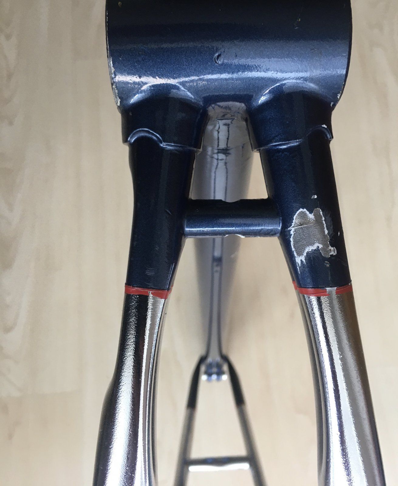 ...irgendwie habe ich den Eindruck, dass das kein Mercier ist: Nicht nur die Ausfallenden sind Zeus 2000, sondern der ganze Rahmen trägt typische Zeus-Merkmale: Die Strebenspiegel mit dem aufgesetzten Deckel, die runden Muffenfenster der Steuersatzmuffen und der Zeus-2000-Gabelkopf.