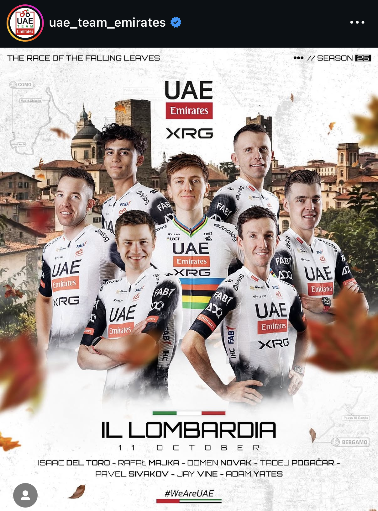 Denke ich auch. Der zieht den Italienischen Herbst voll durch. Morgen Gran Piemonte, Samstag dann evtl. Lombardei.Ich bin mir ziemlich sicher, dass Ayuso nicht fahren wird und stattdessen del Toro am Start stehen wird.