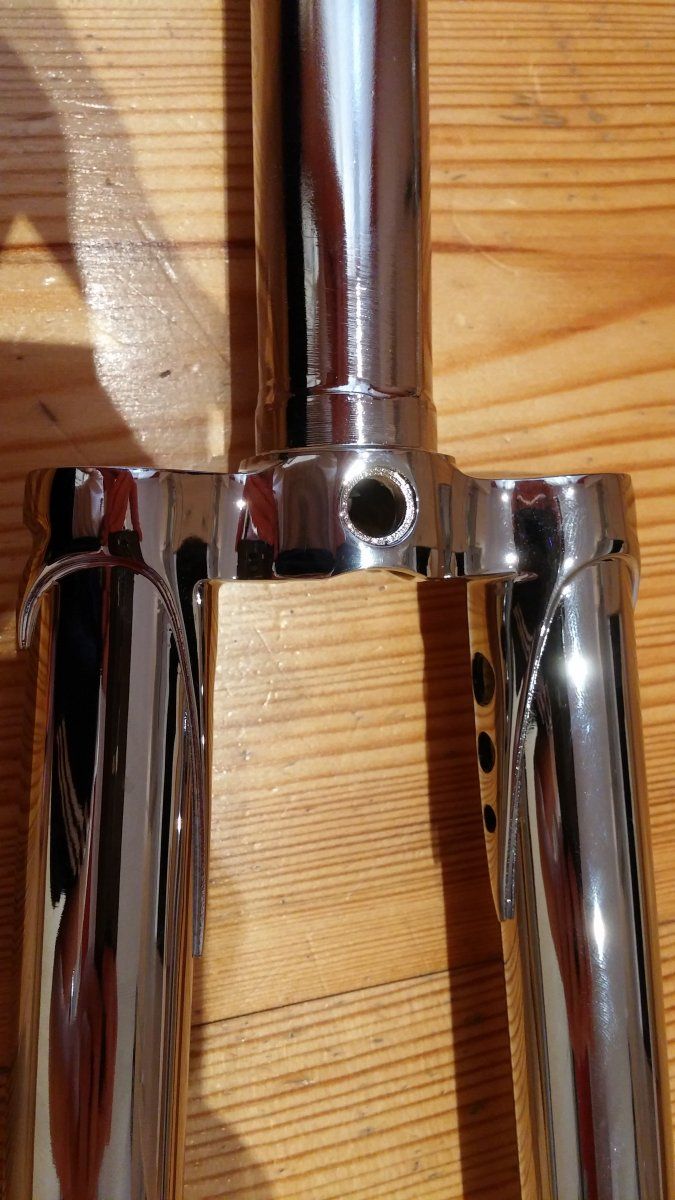 Die gerne vorgeschlagene Variante rückseitig den Gabelkopf für eine Hülsenmutter aufzubohren , halte ich für keine gute Idee , der Chrom ist dann ja beschädigt und du brauchst einen Zapfensenker um eine plane Ringfläche für die Hülsenmutter zu schaffen , nur aufbohren ist Pfusch.