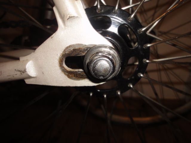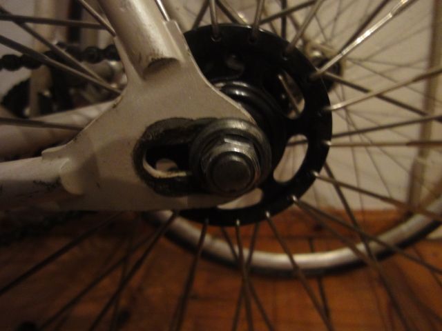 Ich habe mir mal ein kleineres Kettenblatt für mein Bahnrad besorgt. Als ich dann aber die Kette um ein Glied kürzte, schliff das Hinterrad, wenn auf 8 bar aufgepumpt, am Rahmen oben. Die Geometrie ist einfach verdammt eng. Also habe ich das Glied wieder rein gefummelt. Und jetzt sitzt die Achse einfach so unglaublich weit hinten im Ausfallende, dass ich Angst bekomme...