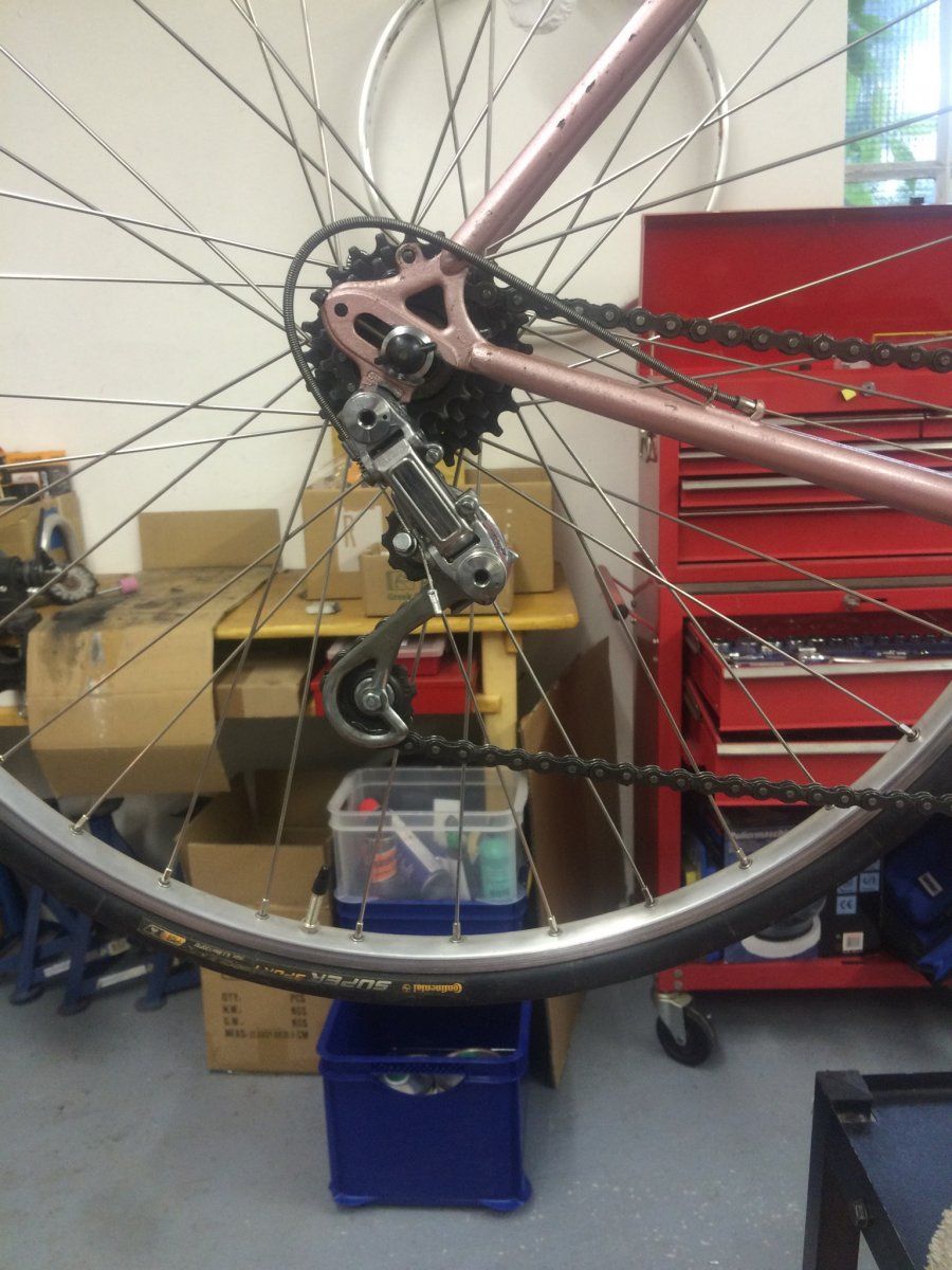Ans Rad meiner Frau kommt ein neuer Schraubkranz 14-28. Dazu habe ich ein Schaltwerk mit langem Käfig drangeschraubt. Das schaltet sich erstaunlich hakelig für ein SLJ. Vorn liegt die Kette auf dem großen Blatt. Stimmt die Kettenläge so?