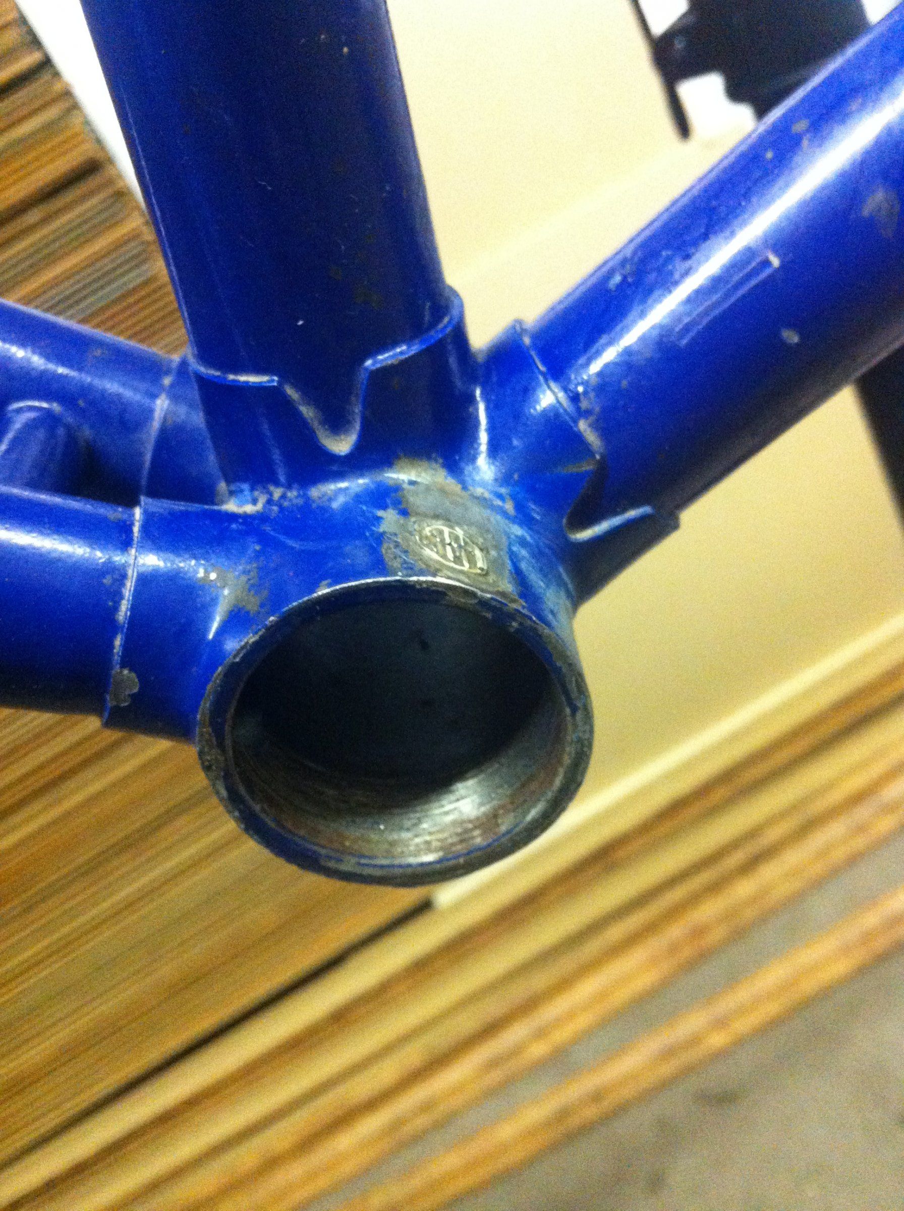 Vor einiger Zeit habe ich ein Kirsch-Rennrad von Anfang der 80er gekauft (am Rad ist eine 600er Schaltung verbaut, die nach Datumcode von 1980 stammt). Oberhalb des Tretlagers ist eine sonderbare "Bastelei" zu sehen.