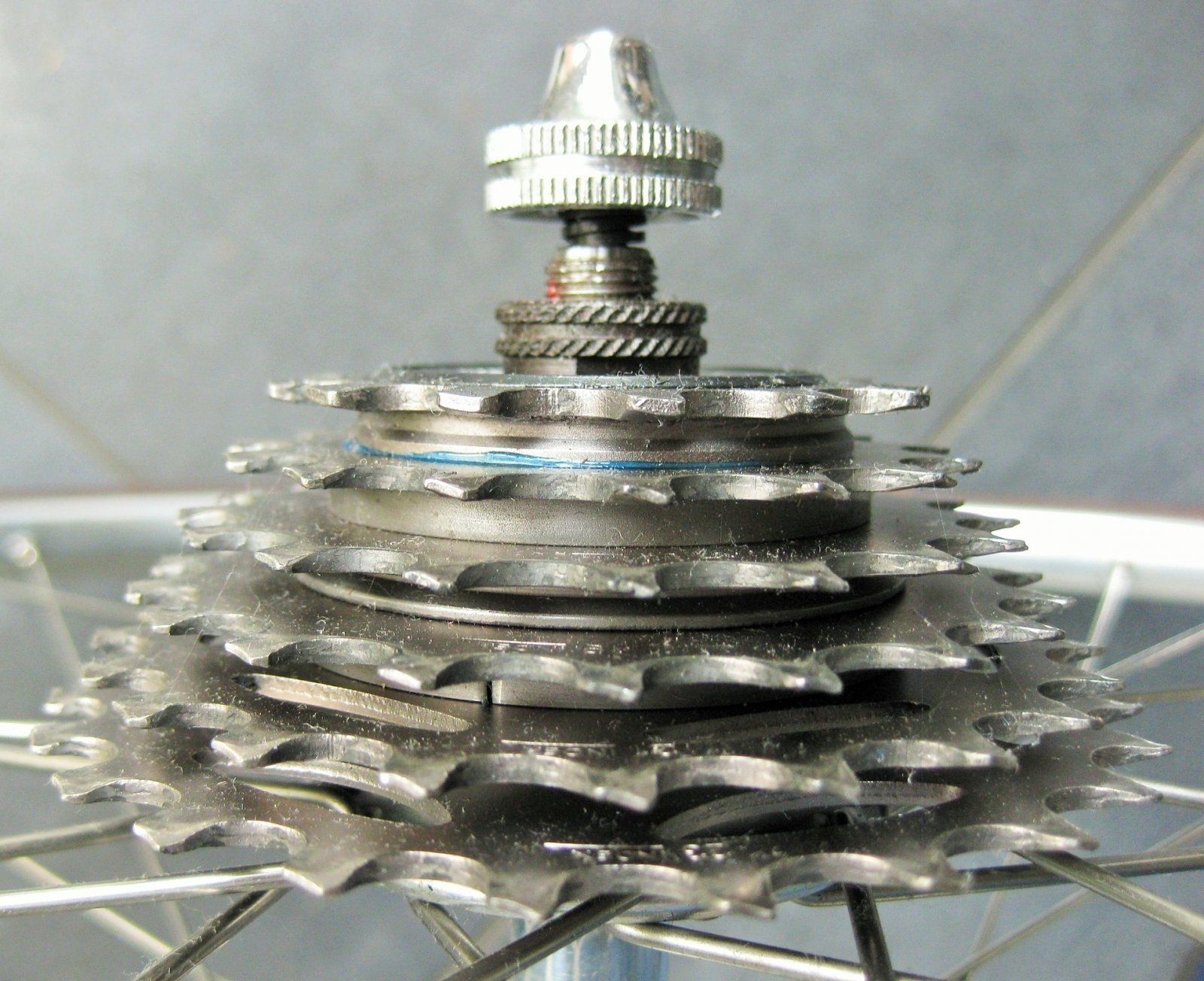Zunächst ein 5fach Schraubkranz Dura Ace MF 7200 auf einer 120mm Campa Hochflanschnabe. Der Ritzelabstand außen vom kleinsten zum größen Ritzel beträgt 25,2mm . Bis zur Kontermutter der Nabenachse ist nur noch minimaler Platz . Also keine Chance , einen üblichem 6fach Zahnkranz zu montieren.