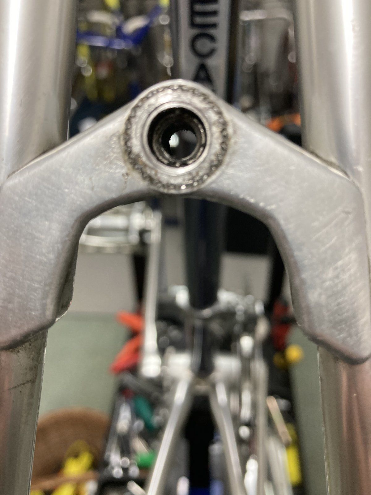 so sieht das ganze ohne Schraube von der Seite der Bremsaufnahme aus - keine Chance die Hülse herauszubringen