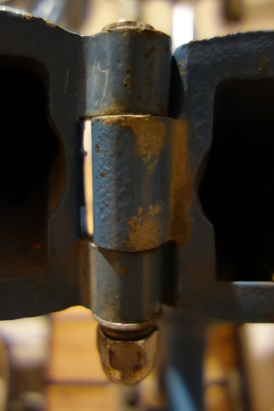 Ich stehe gerade nen bisschen aufm Schlauch. Dieses Scharnier ist mit einem Bolzen gesichert. Unten Hutmuter, Federering, Unterlegscheibe. Oben nix. Hat etwas axiales Spiel, durch den Federering aber nicht allzu schlimm.
