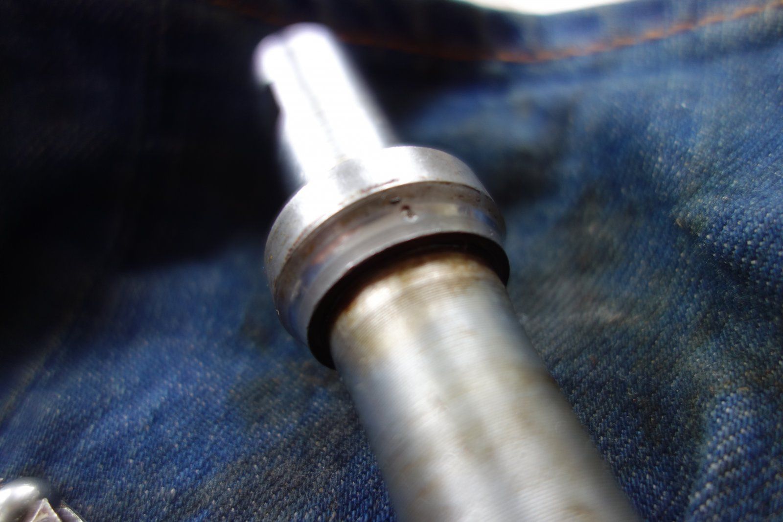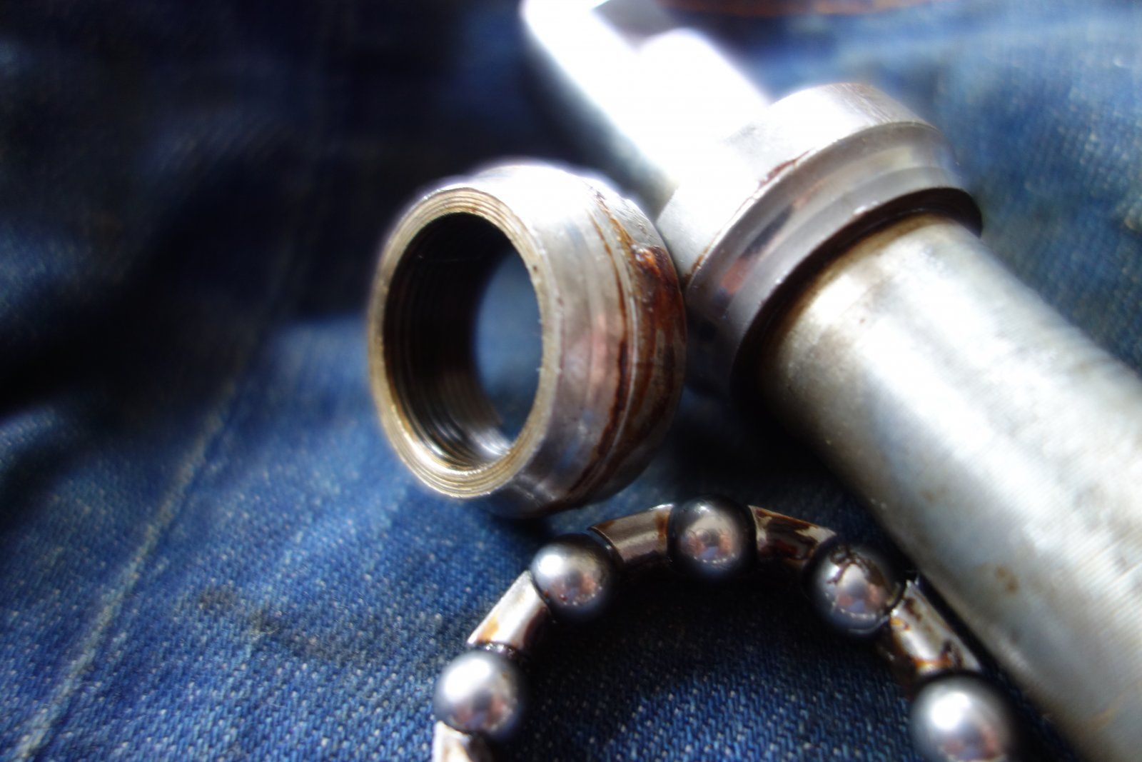 Thompson Innenlager mit Keilkurbel. Vorsichtig demontiert. Lagerschalen im Rahmen sind in Ordnung, Kugeln sind relativ stumpf, der feste (?) Konus auf der Welle hat an einer Stelle Pitting.