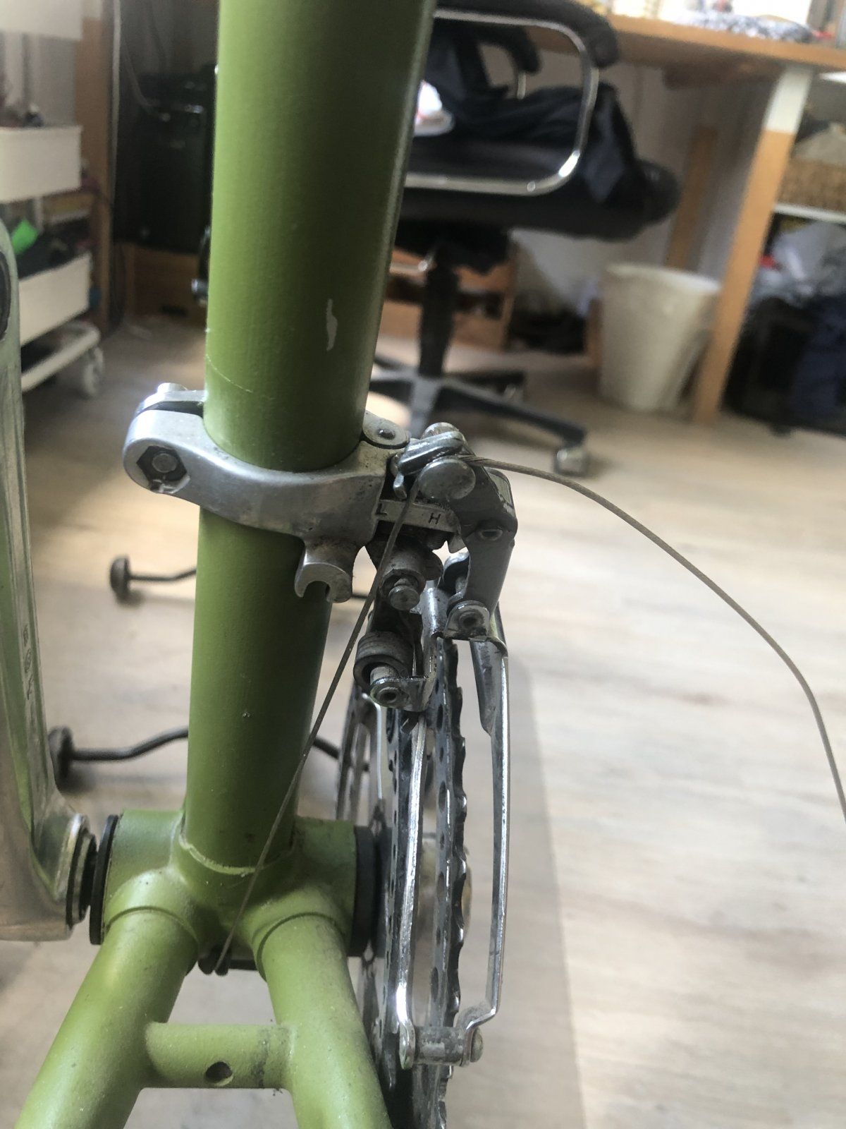 Moment mal, ich habe mir aufgrund des Beitrages von @mr.bibendum den Umwerfer mal genauer angeschaut. Kann es sein das dein Umwerfer defekt ist? Die "Spitze" des Umwerfers, dort wo der Zug befestigt wird, sieht so aus als wäre sie komplett nach unten verbogen! Man sieht auch eine Beschädigung der Beschichtung an der Biegestelle, oder?