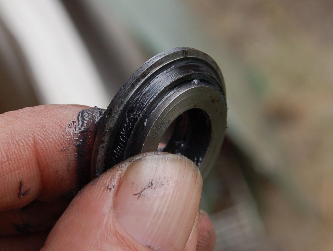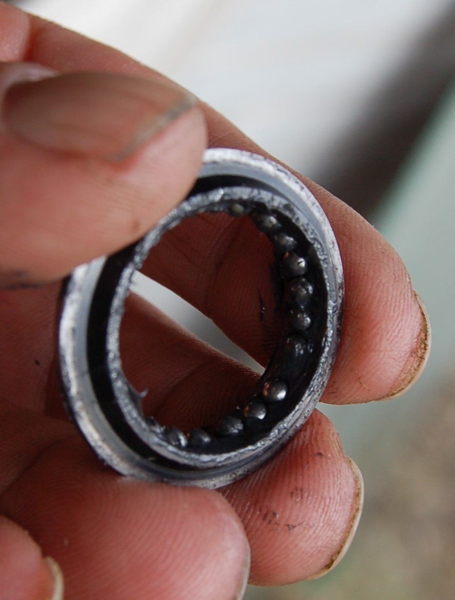 Blieb noch der Käfig mit der Kettenrolle übrig - zum Glück über einer Schale geöffnet weil da gleich mal eine gute Menge sehr kleiner Kugeln heraus gefallen sind. Und nach dem Abziehen des Konus kommt dann doch glatt ein Löchlein zum Vorschein: