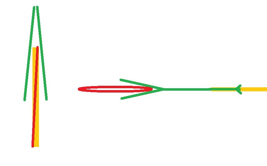 Das Hinterrad läuft auf der Hochachse gerade, in der Mitte zwischen den Kettenstreben. Auf der Längsachse scheint es aber gekippt, sodass es oben schräg unter dem Bremssteg läuft. Habe das mal versucht zu skizzieren und unten angehängt. Edit: Das würde bedeuten, dass das linke Ausfallende zu weit oben sitzt.