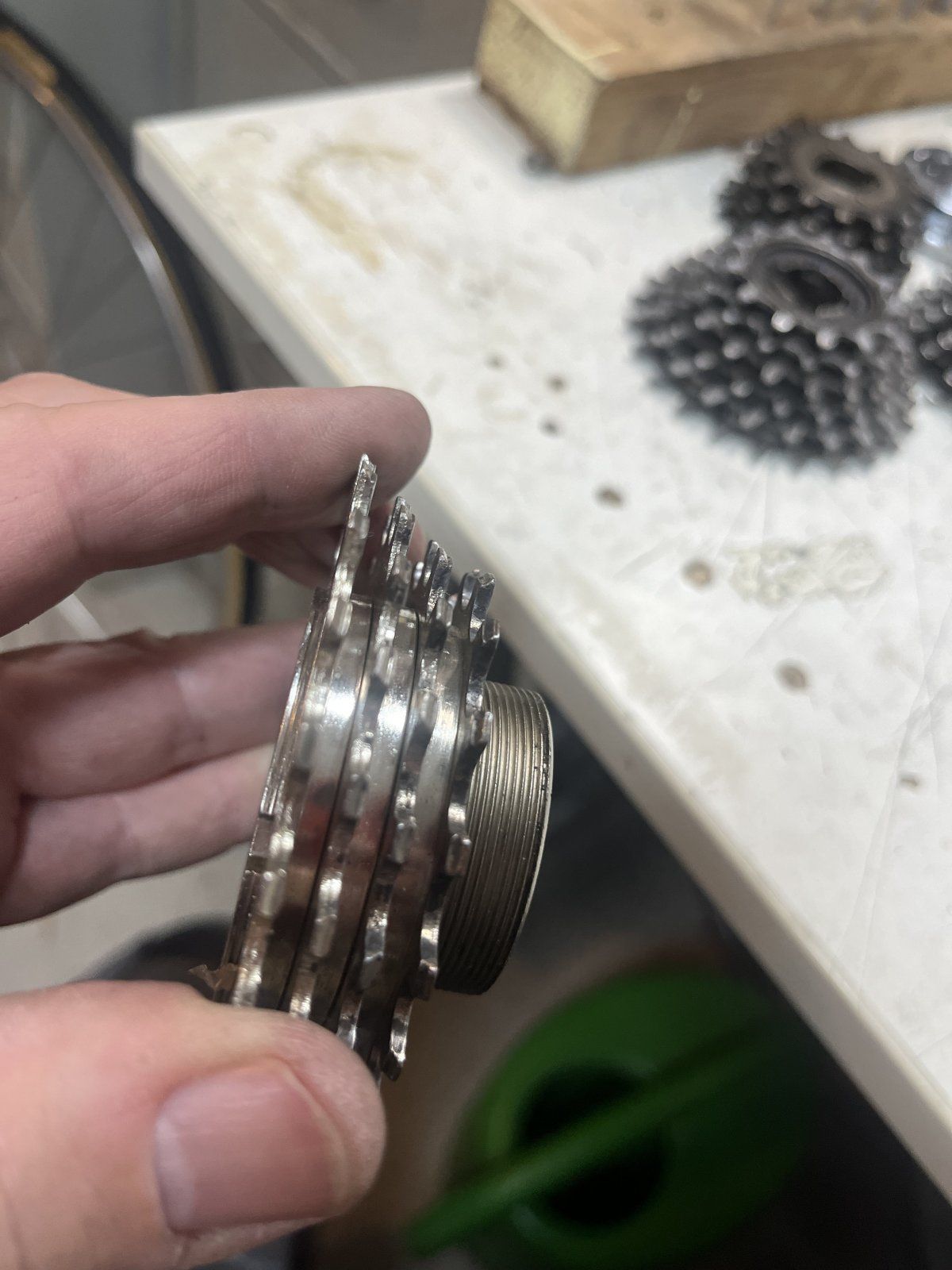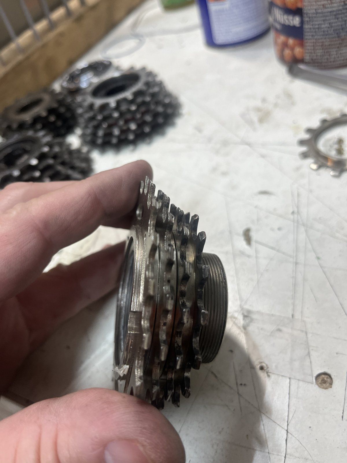 Hallo, ich glaube, daß das viertgrößte (drittkleinste) ritzel falschrum drauf ist. Ich bekommen es aber nicht demontiert; jedenfalls nicht mit zwei Kettenpeitschen, so wie die beiden Abschlussritzel, oder mit vorsichtigem kloppen weg von den grösseren ritzeln. Ist das ein block oder kenne ich den trick nicht?