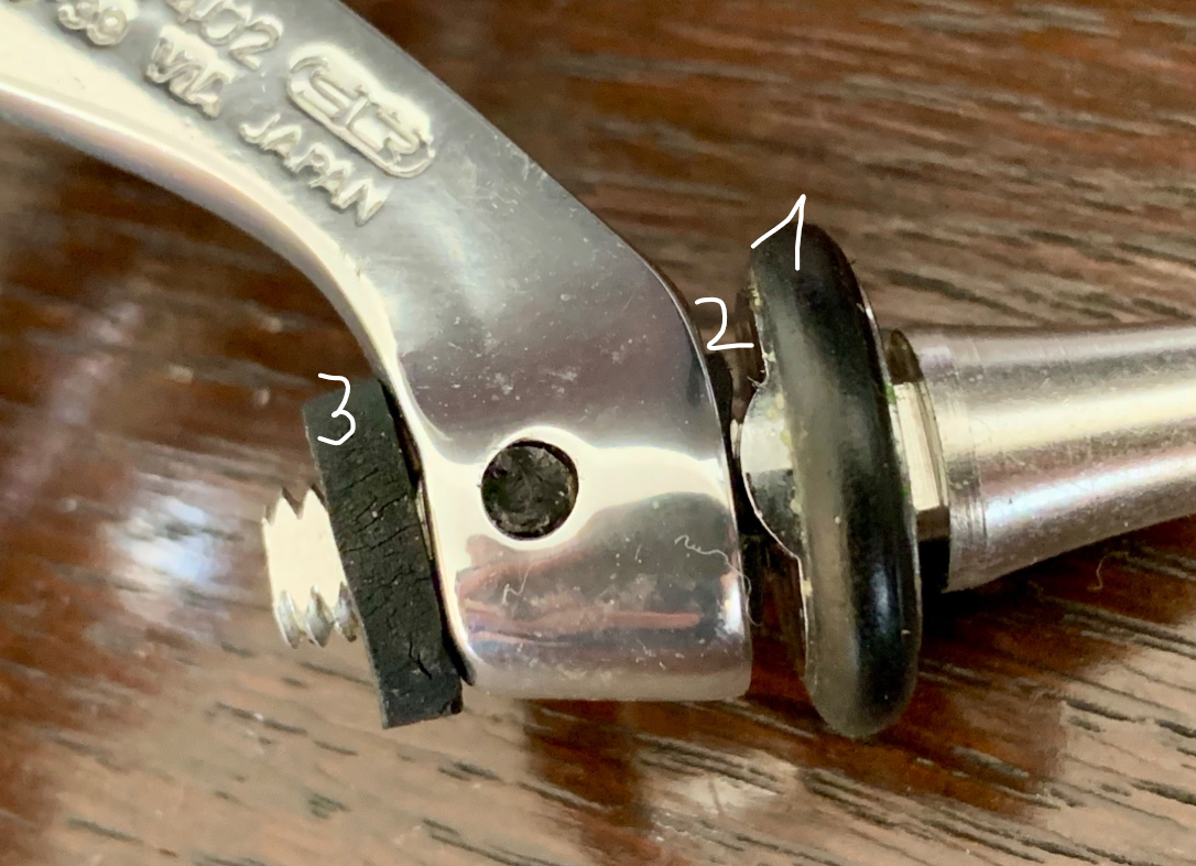 Shimano New Dura Ace BB-7400/7402 Bremse aus 1989. Am Bowdenzughüllen-Einsteller ist nur eine gummiumhüllte Rändelmutter und darunter noch ein Kunststoffhalter, der in die Aufnahme im Arm der Bremse passt. Auf Teilezeichnungen von Shimano https://si.shimano.com/en/pdfs/ev/BR-7402-0936/EV-BR-7402-0936.pdf ist noch eine "Adjusting Bushing" zu erkennen, also eine Einstellbuchse, Teilenr. 20. Sieht wie eine Mutter aus, aber ich wüsste nicht, wo die hin soll. Kann mir jemand sagen, wonach ich suche? Ich kann mir kaum vorstellen, daß der Einsteller einfach so locker im Arm sitzen soll und nur durch die Seilspannung darin gehalten wird. Danke und frohe Ostern! Chris