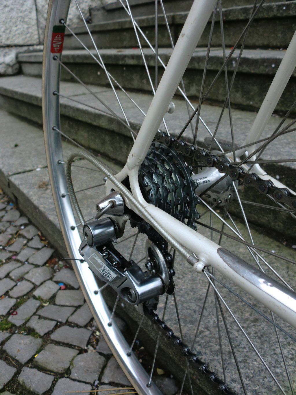 Die verchromte Nase auf der Mitnehmerscheibe, wo die prominente "B" Schraube sitzt, müsste 270 Grad nach links gedreht am kl. Anschlag neben dem Schaltwerkbolzen anliegen. Also entweder Feder im Auge entspannt oder so etwas in der Richtung.