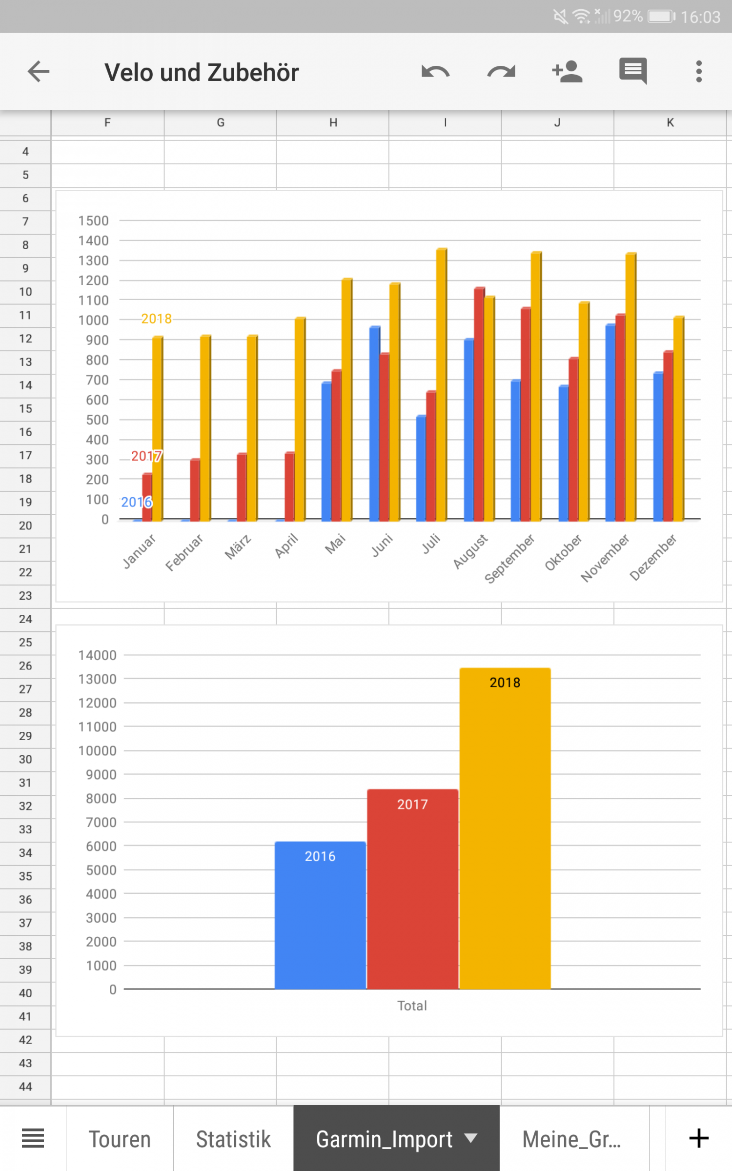 So trage ich meine letzten Radfahrten in meine Exceltabelle und freue mich über die Entwicklung meiner Jahreskilometer.