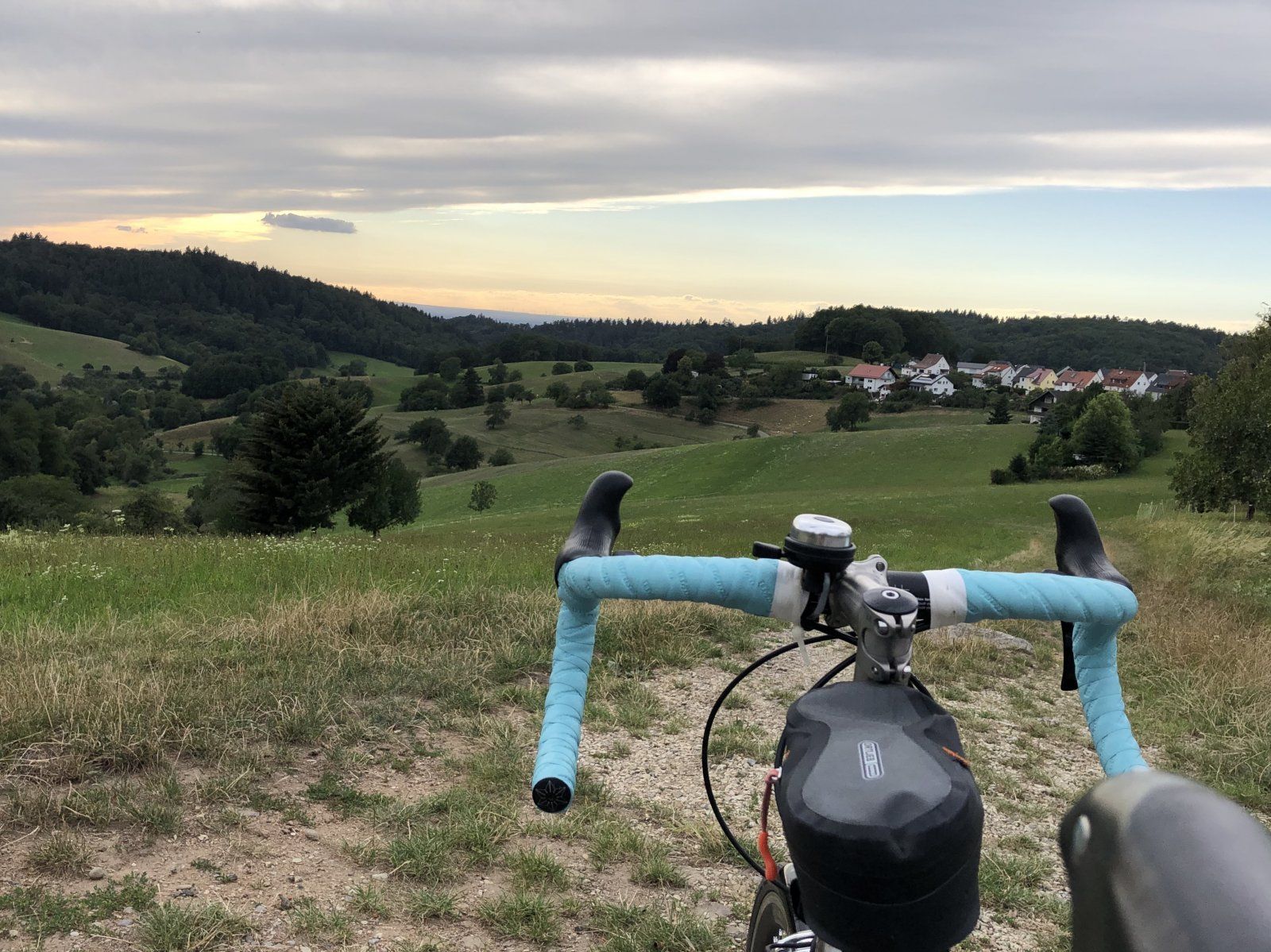 Hier hatte es am späten Abend angefangen zu regnen mit Gewittern dazu. Das war dann rechtzeitig zum morgendlichen Losradeln zuende, also nurmehr naß von unten. Ich habe aber dennoch Ms. White genommen, da sie ja Erfahrung mit solchen Bedingungen hat. Da ist mir dann aber schlagartig die Wohltat eines lautlos arbeitenden Antriebs aufgefallen und daß mir der Daumenhebel von Campa zum schnellen Schalten vor allem beim Beschleunigen doch lieber ist als die Lösung von Shimano. Daß die Kette nicht zu hören ist im Gegensatz zu Blufeld mag auch daran liegen, daß der eine Rahmen Alu und der andere Carbon ist, aber der Unterschied ist so krass, das ist heftig.