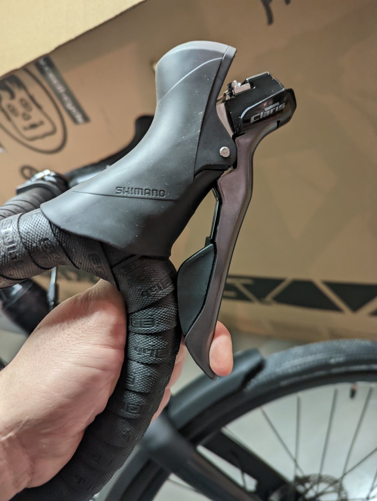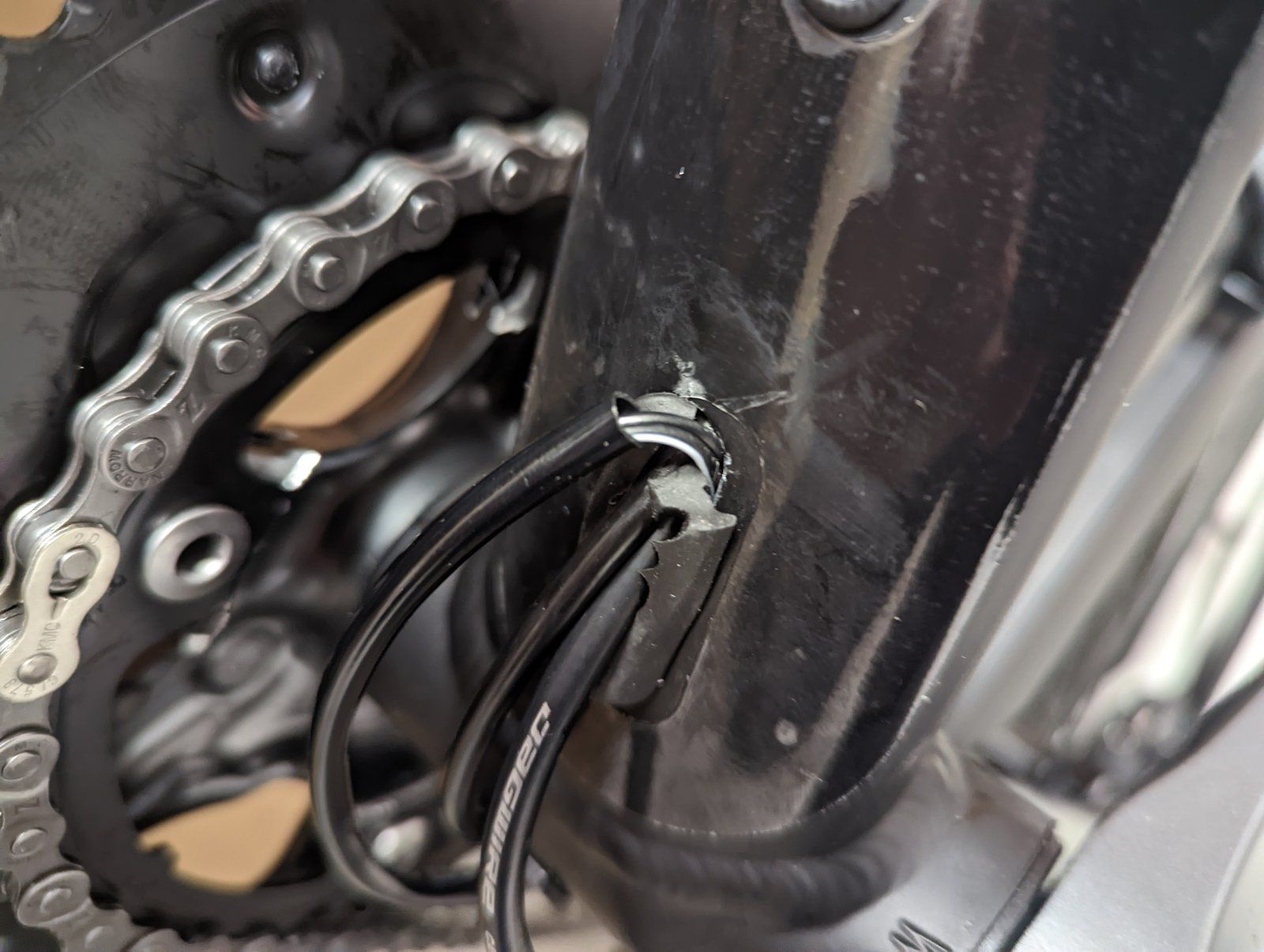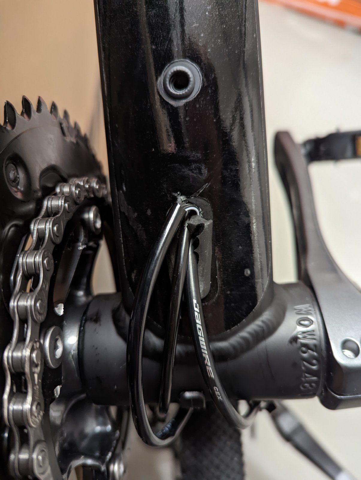 Schaltung nicht eingestellt, Bremsehebel steht beim bremsen am Lenker an (und betätigt dann den Schalthebel 😂), Lenkerband nicht sauber verklebt, das löst sich jetzt schon und als Krönung ein kaputter Rahmen-Kabeleinlass in dem die Kabel total verhunzt drinnen hängen. 😕