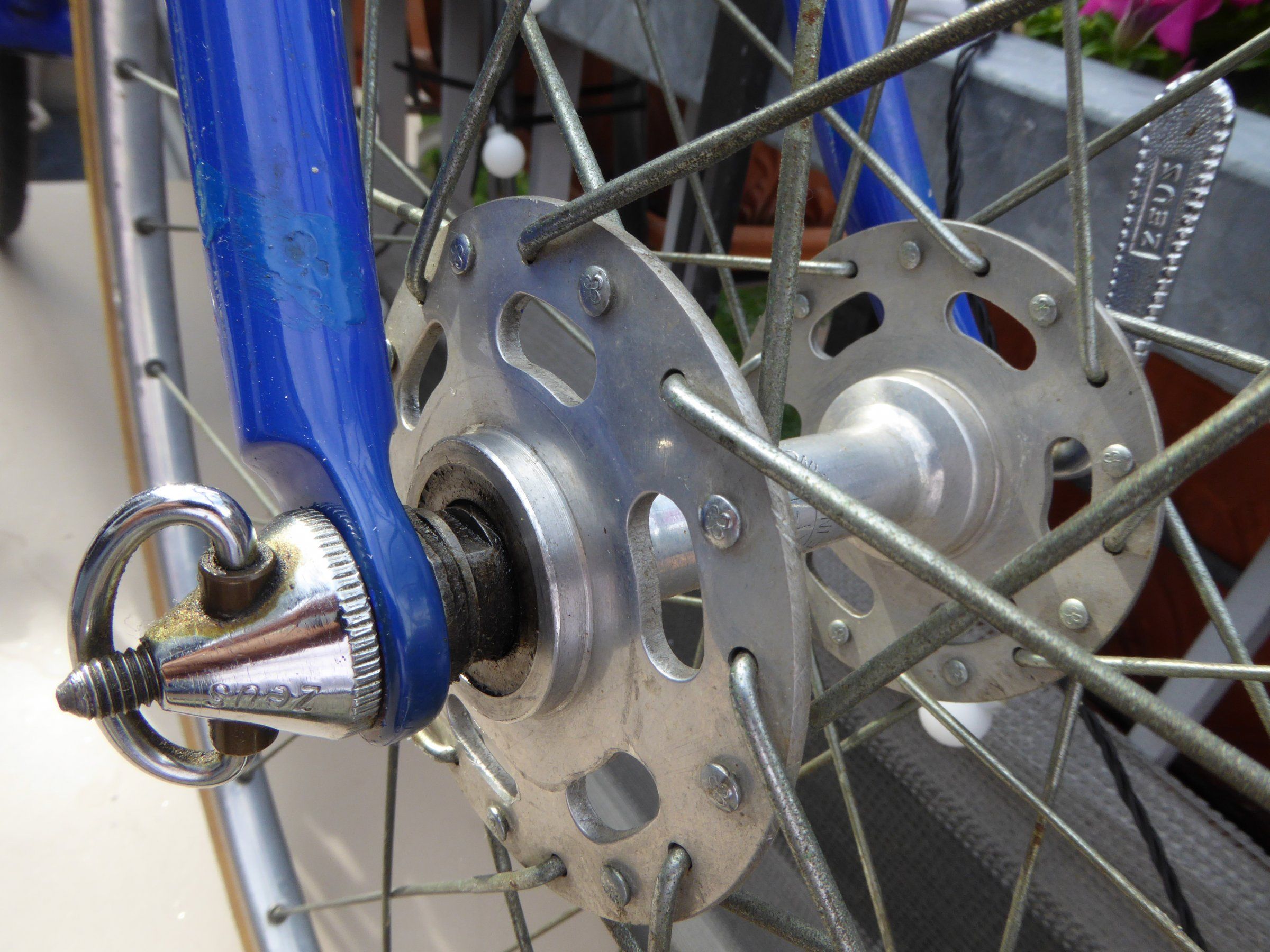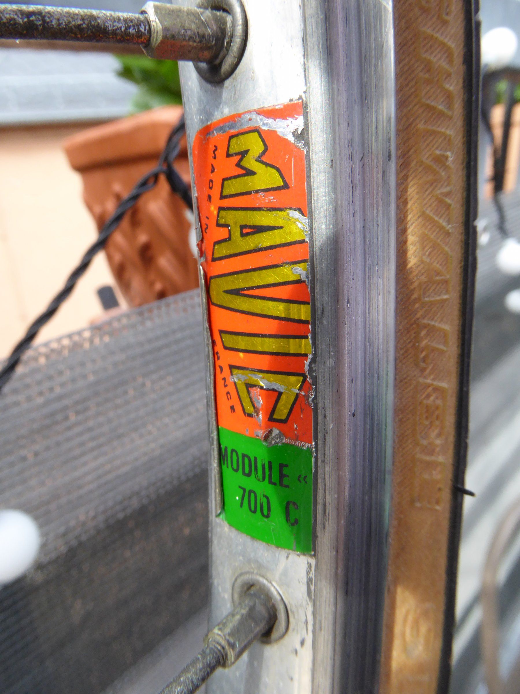 Bei ein paar Sachen bin ich unschlüssig, könnten aber original sein: Zeus Steuersatz, leider mit vermackter Konterschraube, aber absolut sahnigem Laufverhalten, Zeus Schnellspanner vorn, SR-Sakae-Kurbel. Laufradsatz Mavic Module-Felgen mit REG France Hochflanschnaben.