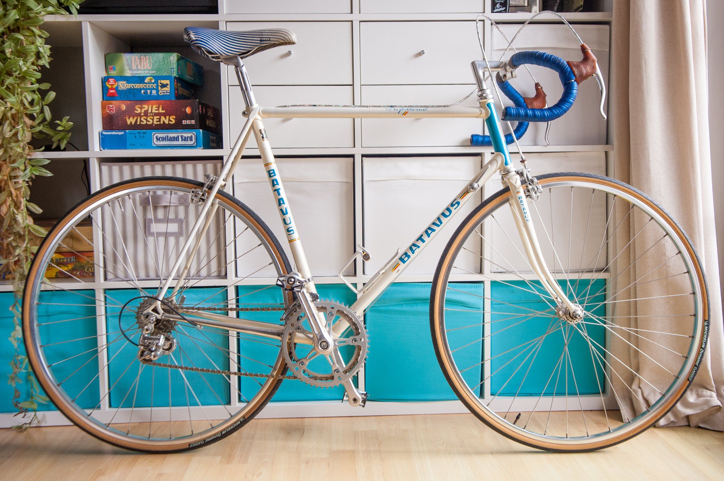 das Rad stand in Augsburg inseriert, eine Seitenstraße vom Velodrom entfernt. Beim Abholen vom Vorbesitzer erfahren, dass er damals beim Bau der Radrennbahn dabei war, er hatte unter anderem die Holzdielen Latte für Latte genagelt, tagelang. Leider hatte ihn nie so wirklich die Passion Rennrad ergriffen, daher dann auch der Verkauf des Batavus.