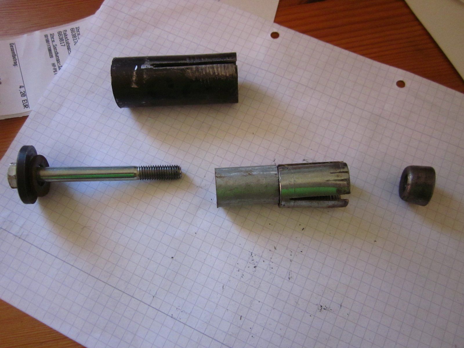 Mir schwebt so eine Lösung vor, das Teil habe ich schon mal vorgestellt, es dient dazu, die Sattelklemmung zu weiten und rund zu bekommen, wenn sie vergnaddelt ist. Der Konus weitet das Rohr. So was mit einer langen Gewindestange im richtigen Durchmesser... Besteht nur die Gefahr, dass das Rohr an falscher Stelle raus gedrückt wird.