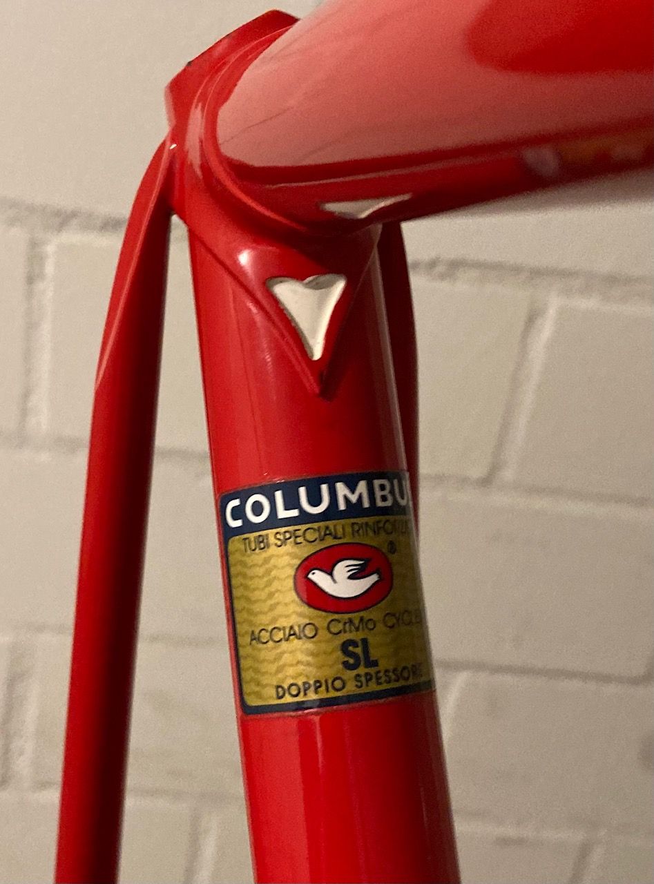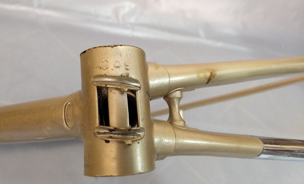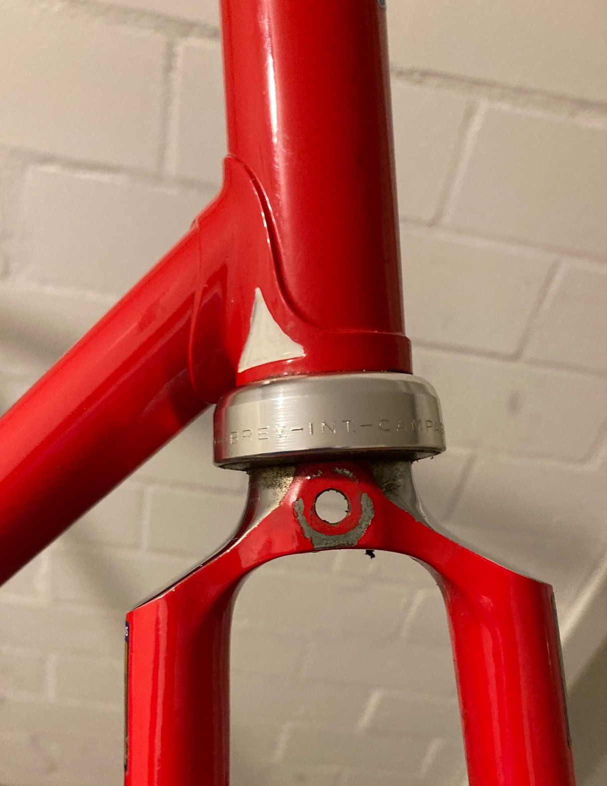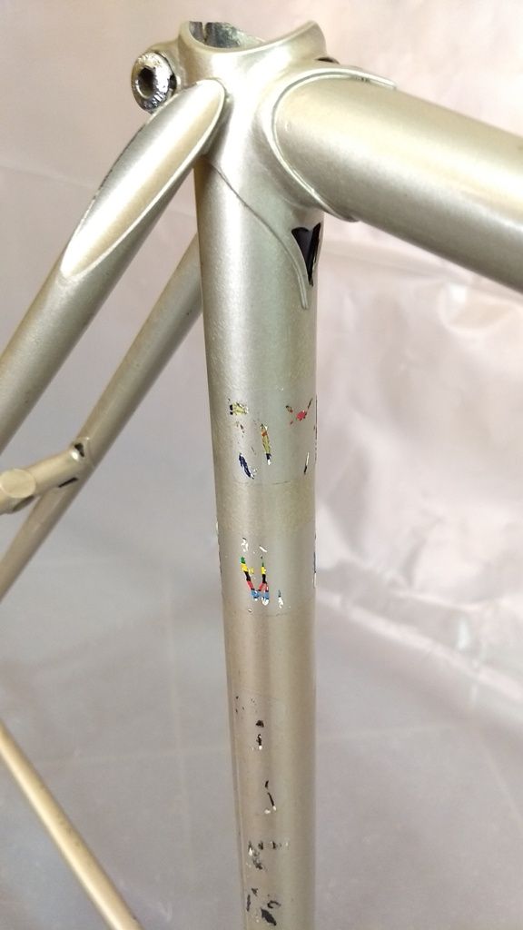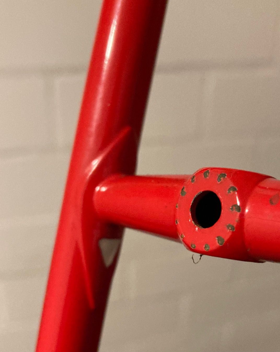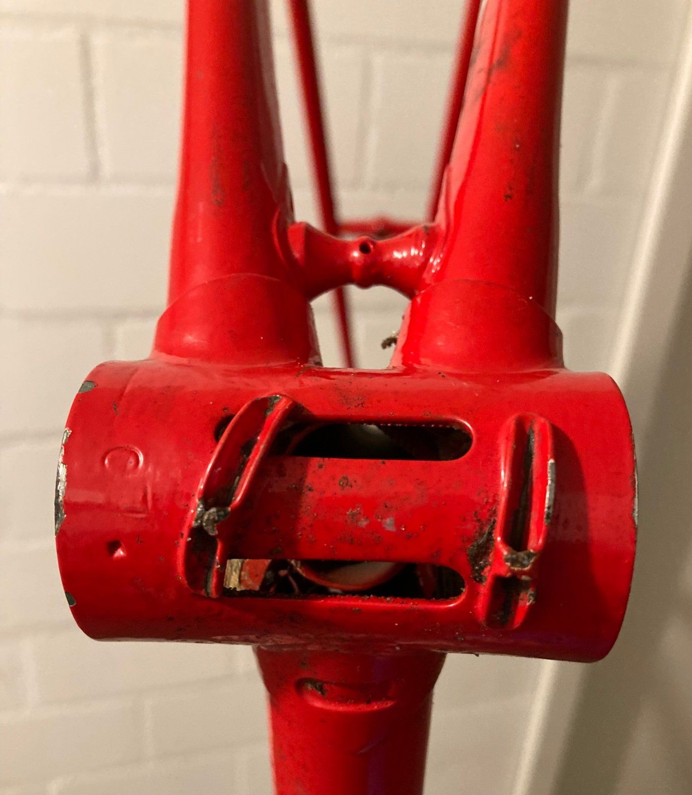 Zustand des Rahmens scheint sehr gut. Er ist gerade, Gewinde scheinen alle in Ordnung und der Lack ist bis auf ein paar kleine Chips noch super. Die mitgebrachte Sattelstütze in 27,2 wollte nicht ohne Druck in den Rahmen. Das schau ich mir morgen mal genauer an. Verwürgt sieht die Klemmung jedenfalls nicht aus. Ob der Aufkleber mit SL stimmt