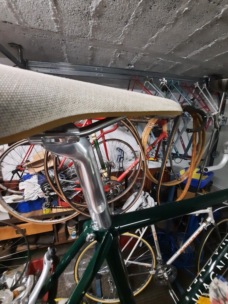Ich habe heute mal den Fang von letzter Woche geputzt. Ich nähere mich so vorsichtig dem Rahmen an. Es ist ein später André Sablière. Er hat bereits Führungen für Schaltzughüllen am Steuerrohr, massivere Ausfaller, und eine innengeklemmte Sattelstütze.
