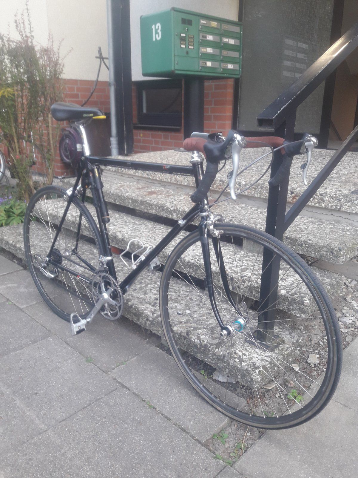 Weil ich es nicht zur Börse schaffte bin ich heute aus Frust nach Duderstadt gefahren und habe zum fairen Kurs eine DuraAce gekauft. Leider ist die VR-Nabe eine 600er, die Sattelstütze eine Miche Primato und der Steuersatz mit Rasterung. Der Rahmen ist mir mit RH58 zu groß und laut Aussage des Vor- und Erstbesitzers das Beste was es 1992 von Peugeot aus Stahl gab. Irgendwas mit Reynolds 700 oder so, sagt er. Kommt mir auch sehr leicht vor. Wurde leider von ihm mal schwarz gepulvert und mit Rose Aufklebern gepimpt. Werde die Tage nach Demontage die Waage bemühen.