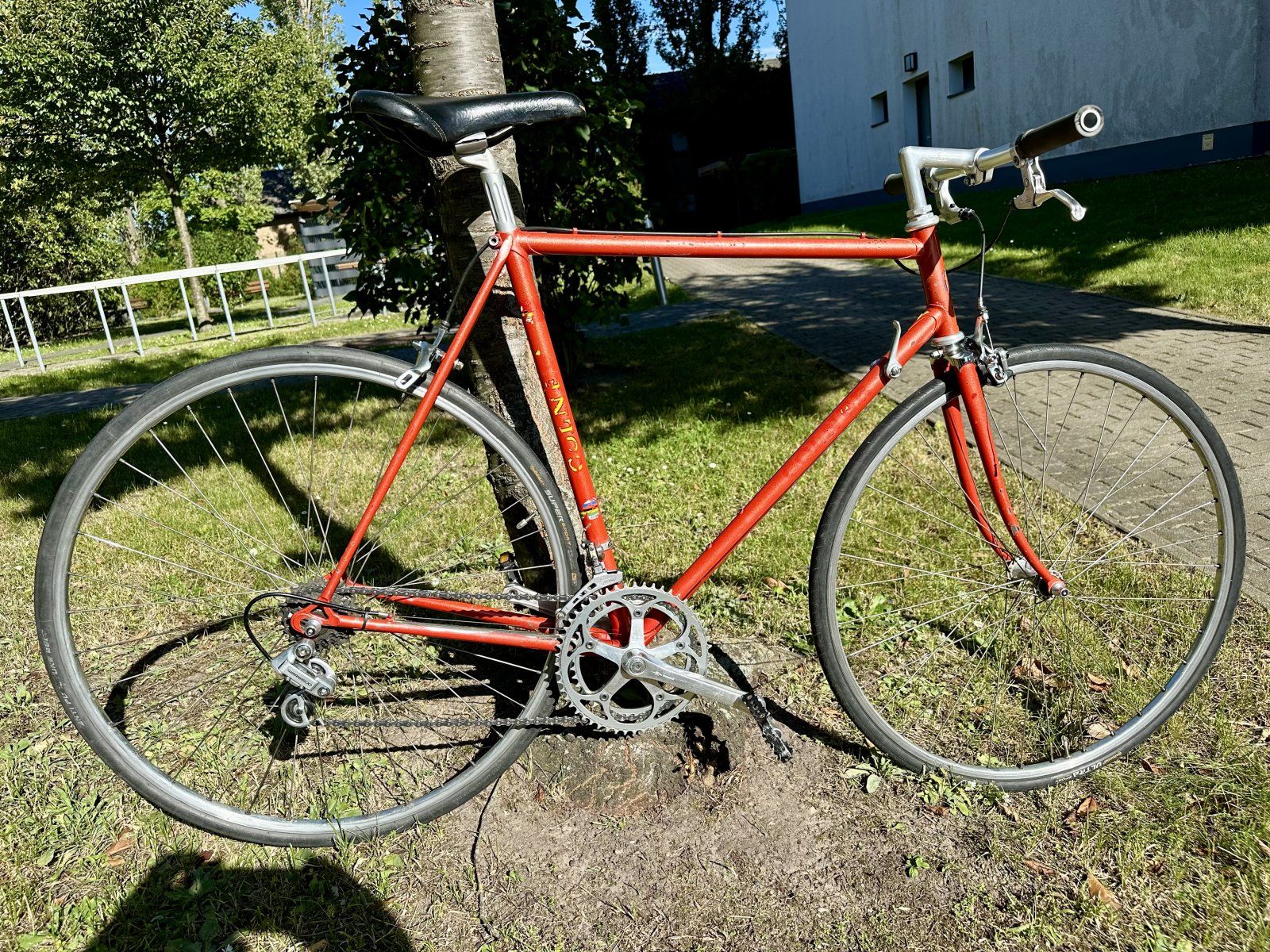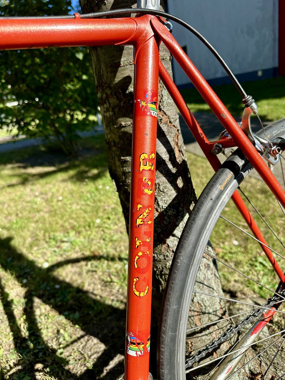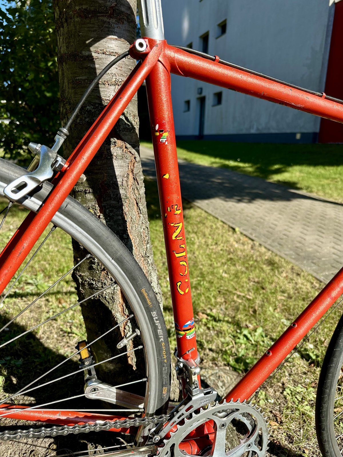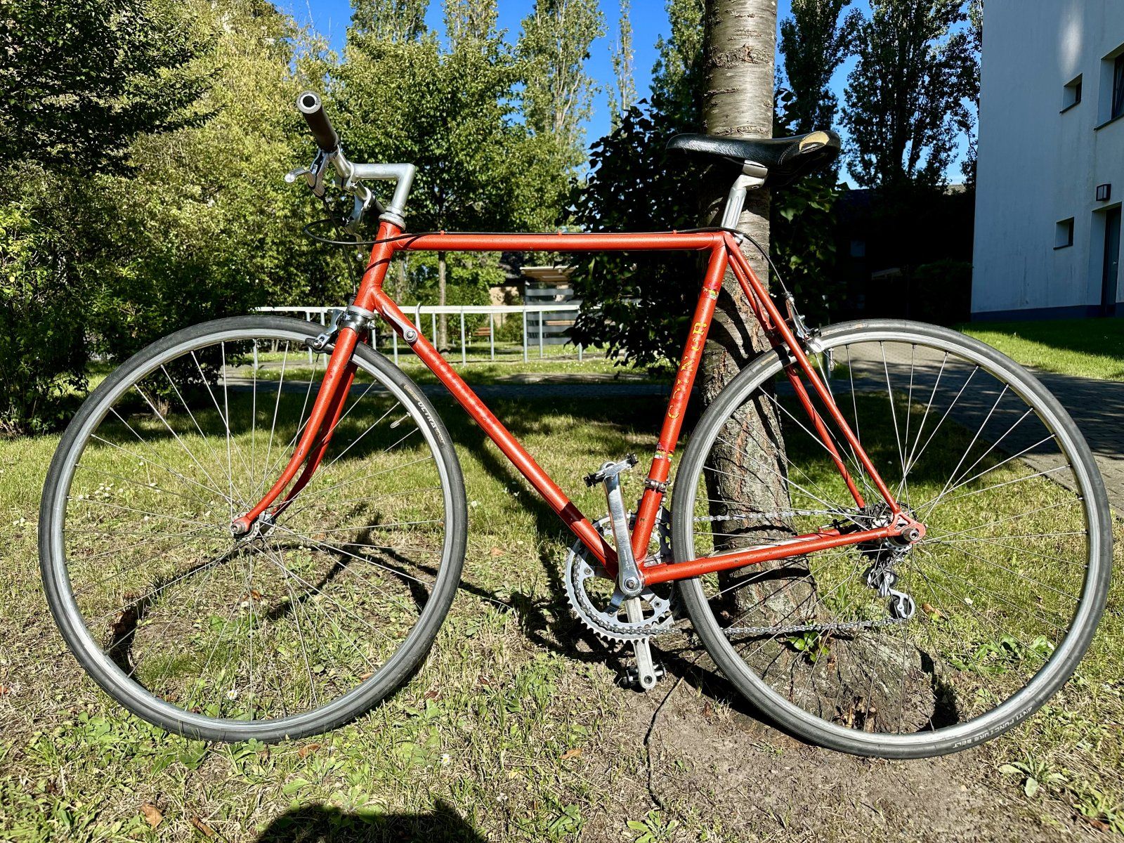 Ein Colner Colnago in einem leicht glitzernden rot orange. Den grausamen Lenker und den Sattel. denkt ihr euch bitte weg. Ich weiß zwar, dass es diese Colners gibt, kann da aber bis jetzt überhaupt nichts zu sagen.