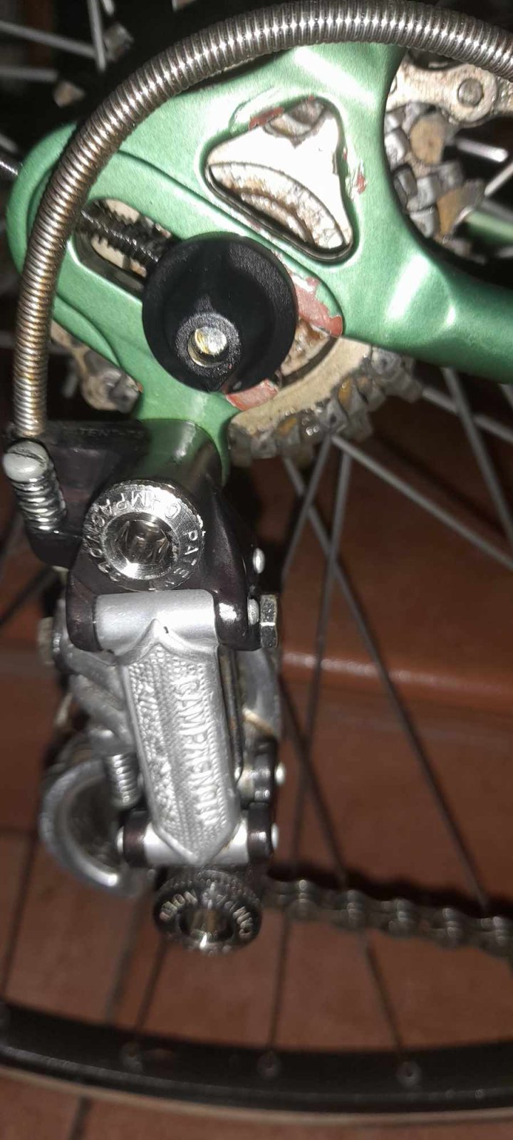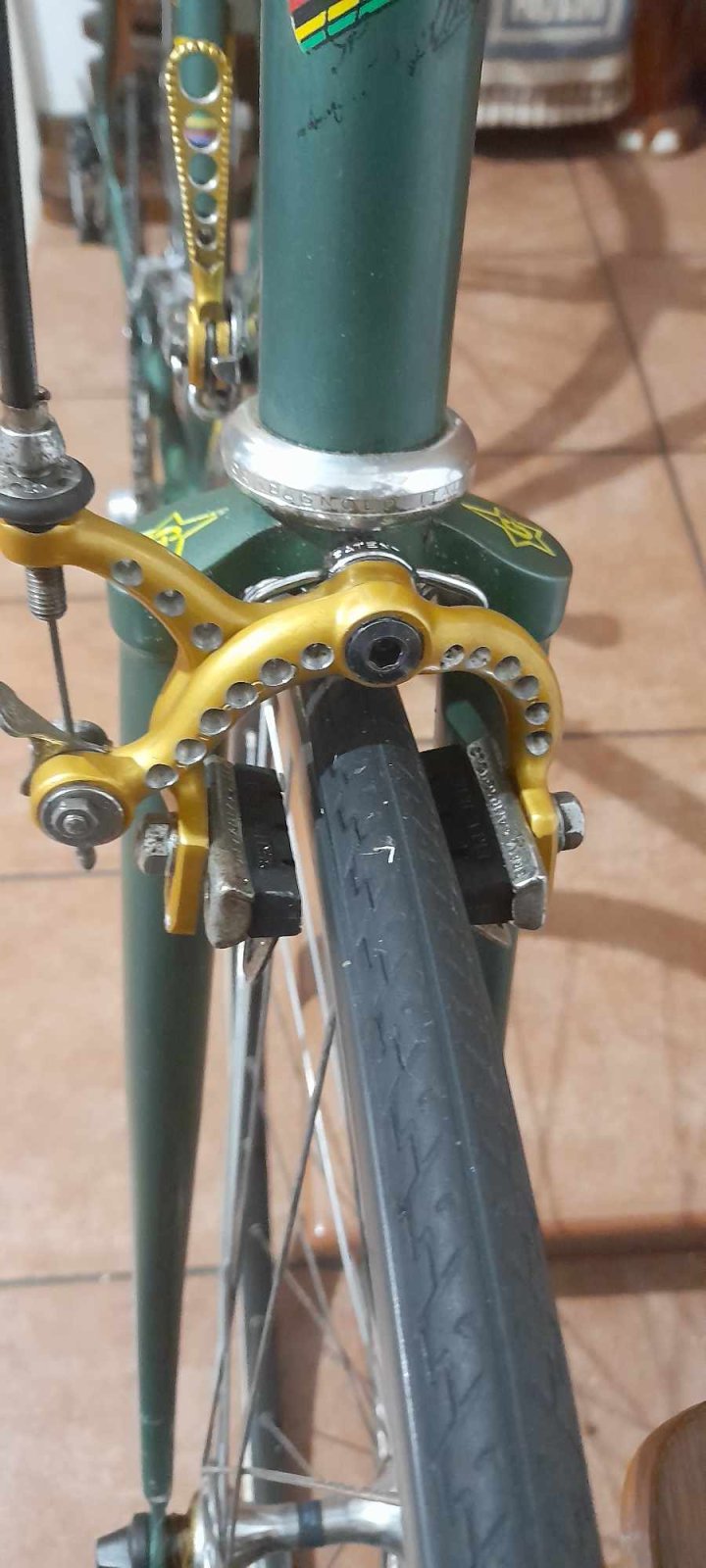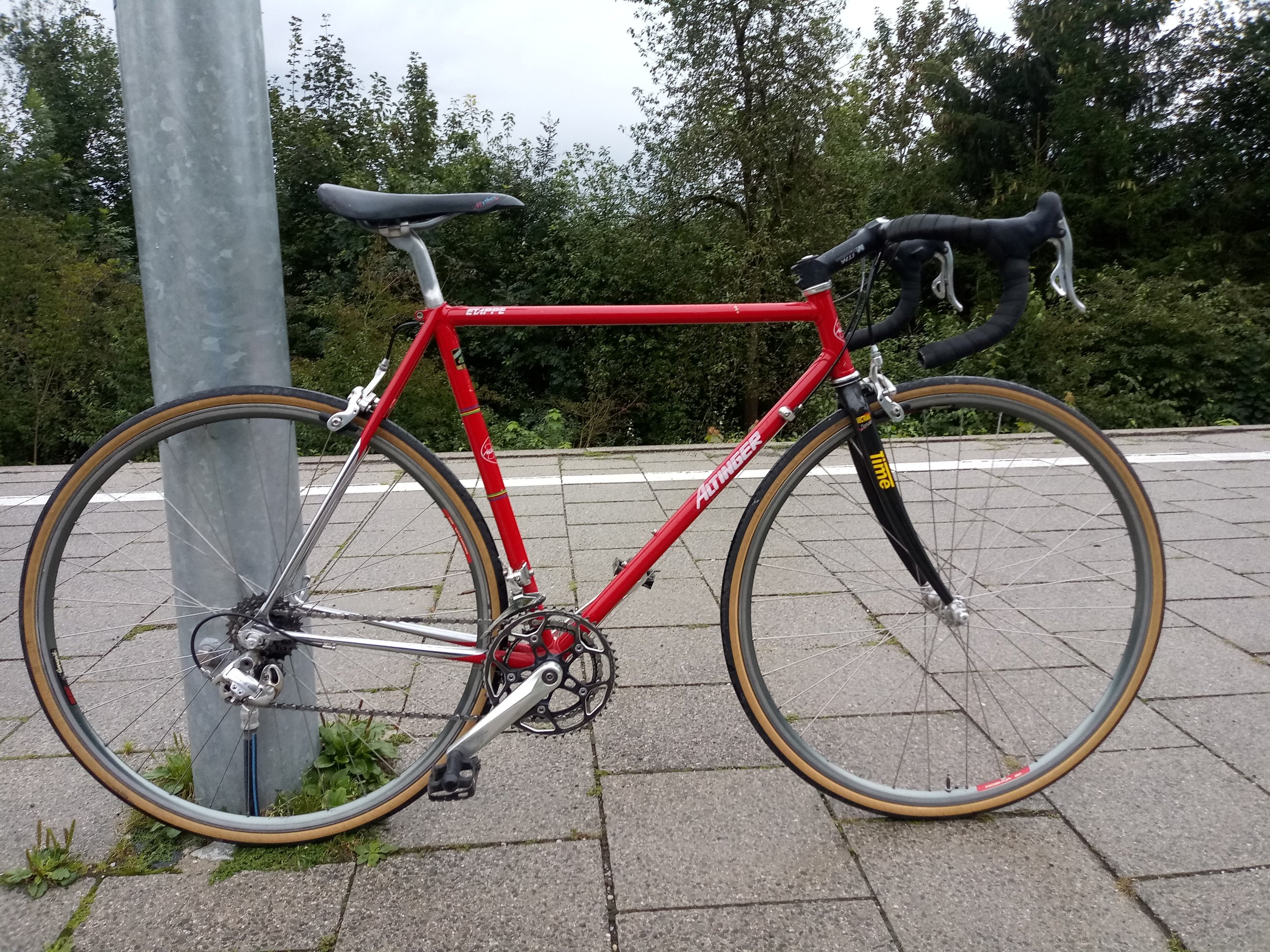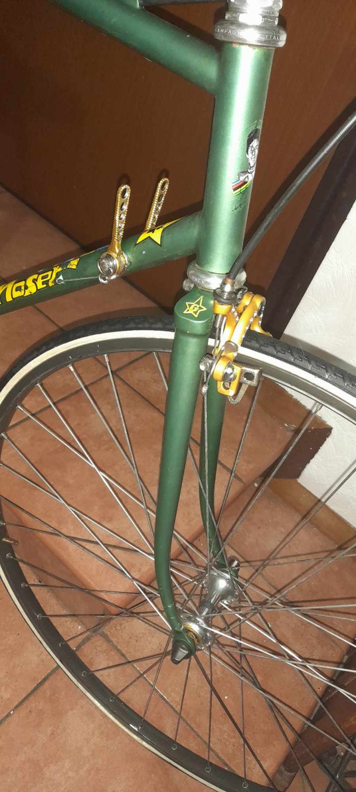 Einer der frühen Titanrahmen von Compre und der bisher einzige in kompletter Aeroführung. Die güldenen Bremsen, Kurbel und Schalthebel scheinen original. Mal schauen, ob das bleibt. Der Lenker ist natürlich eine Perversion. Die Moserdecals sind vermutlich nicht original, aufgrund der Guerciotti-Pantogabel. Das Waldgrün gefällt mir aber sehr.