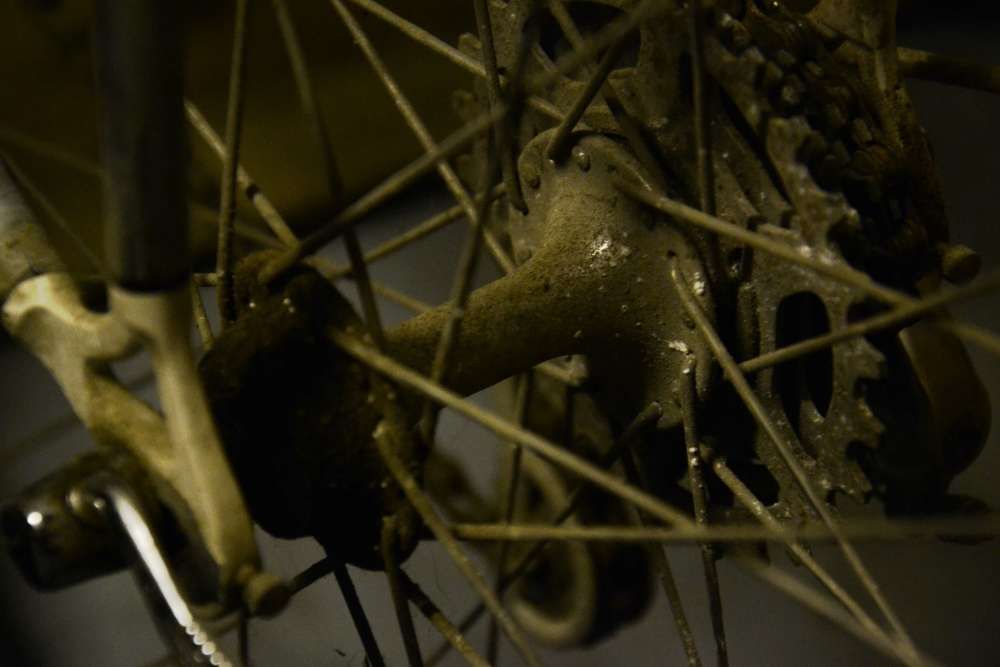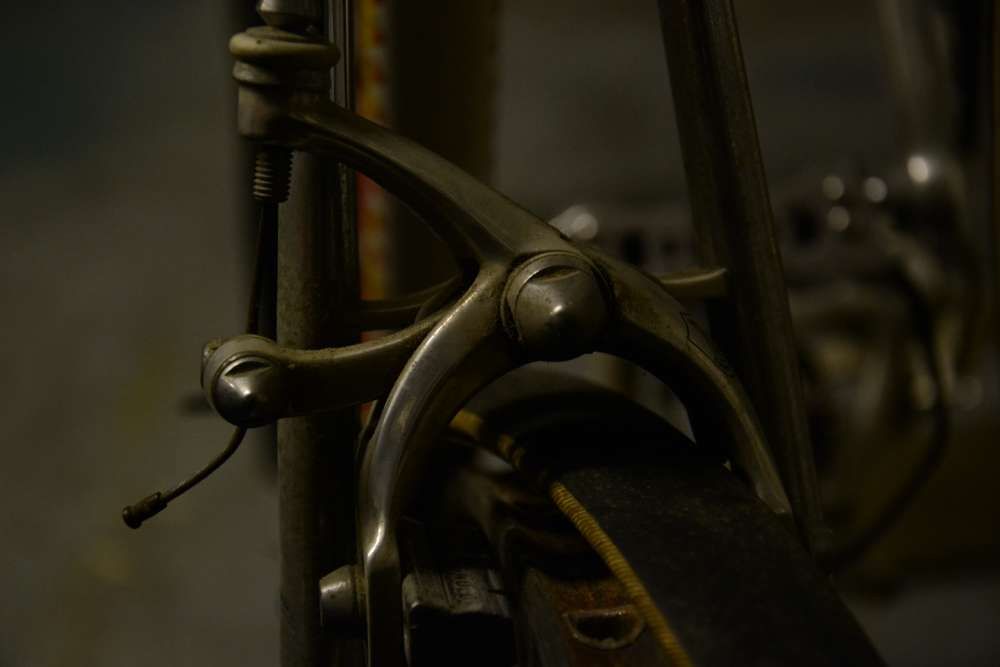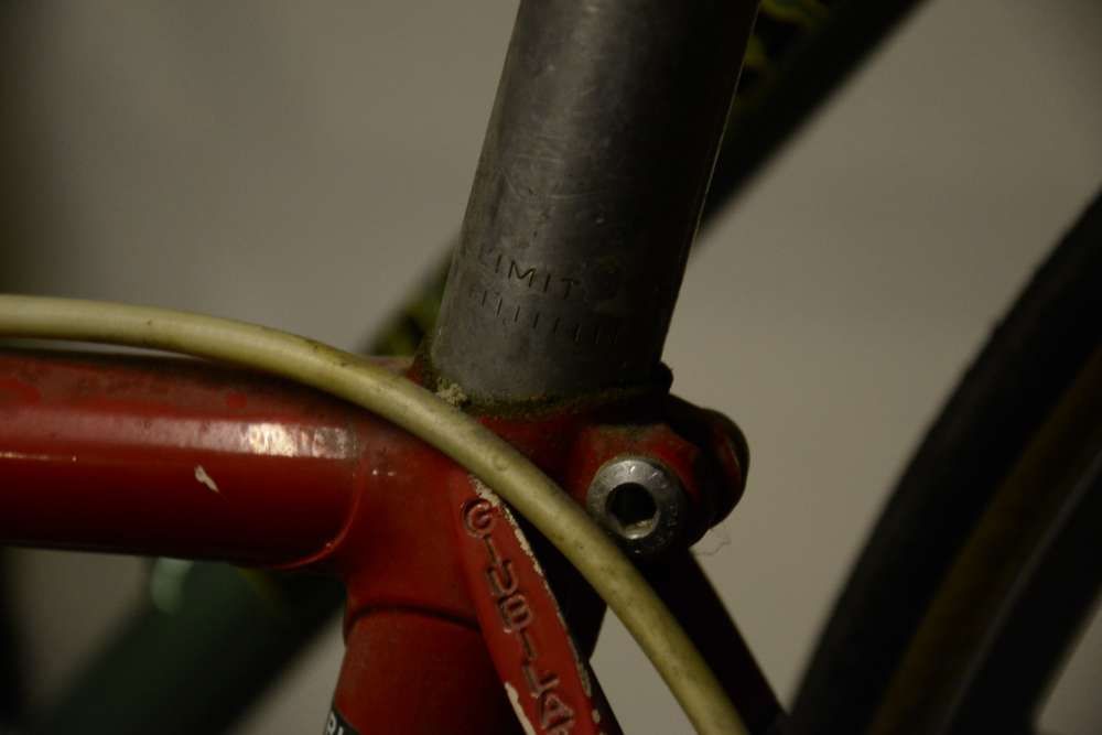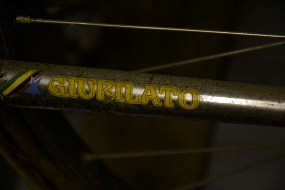 Dieses Rad hat mir mein Onkel für den schmalen Preis von 100€ überlassen: Ein Giubilato welches er in Italien gekauft hatte und nur ca. 2000km gefahren hat, bevor es dann ungefähr 20 Jahre in der Scheune stand. Unter all dem hässlichen Dreck und alten Öl befindet sich eine komplette Campa Chorus Gruppe, 3ttt Lenker und Vorbau, der Rahmen ist aus Columbus Cromor Or. Das Rad befindet sich im originalen Zustand. Die originalen Campa-Bremsklötze sind noch sehr gut gebrauchbar, die Magnesiumbeschichtung der Mavic-Felgen ist nur ganz leicht angebremst! Und wenn man das Rad dann mal wieder ein wenig pflegt, sieht es auch gar nicht mehr so grausig aus.