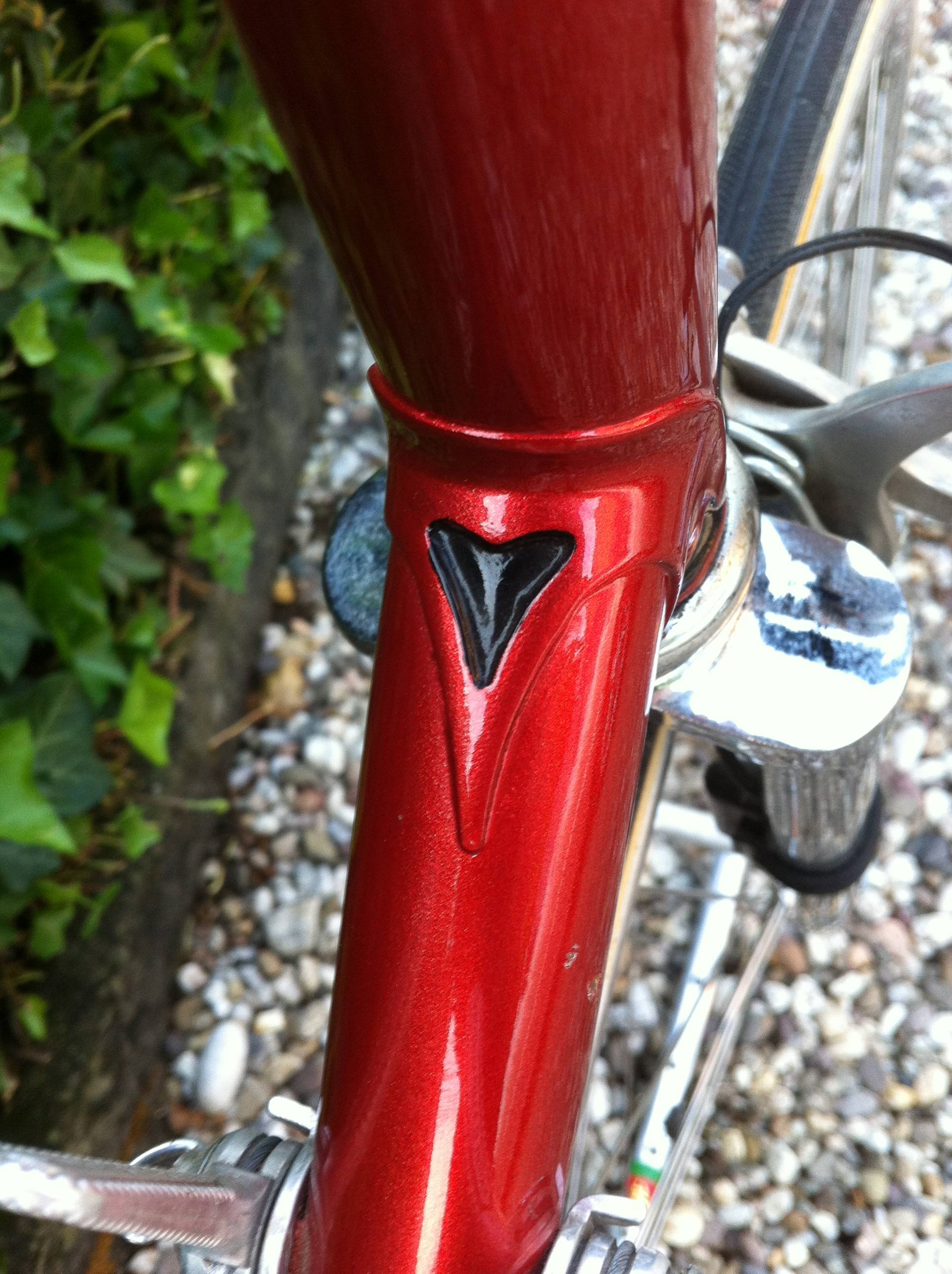 Es handelt sich um ein Mercier Campagnolo Nuevo Record, das wohl nur wegen der hässlichen Original-Farbe mit einem sportlichem Rot überlackiert wurde. Sämtliche Teile vom Laufrad über die Lenkerstütze bis hin zu Bremsen und Felgen sind noch original und bestens in Schuss. Nur die Klickpedale von Look sind neu.