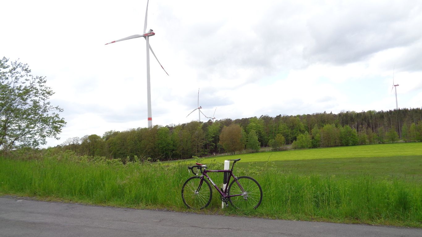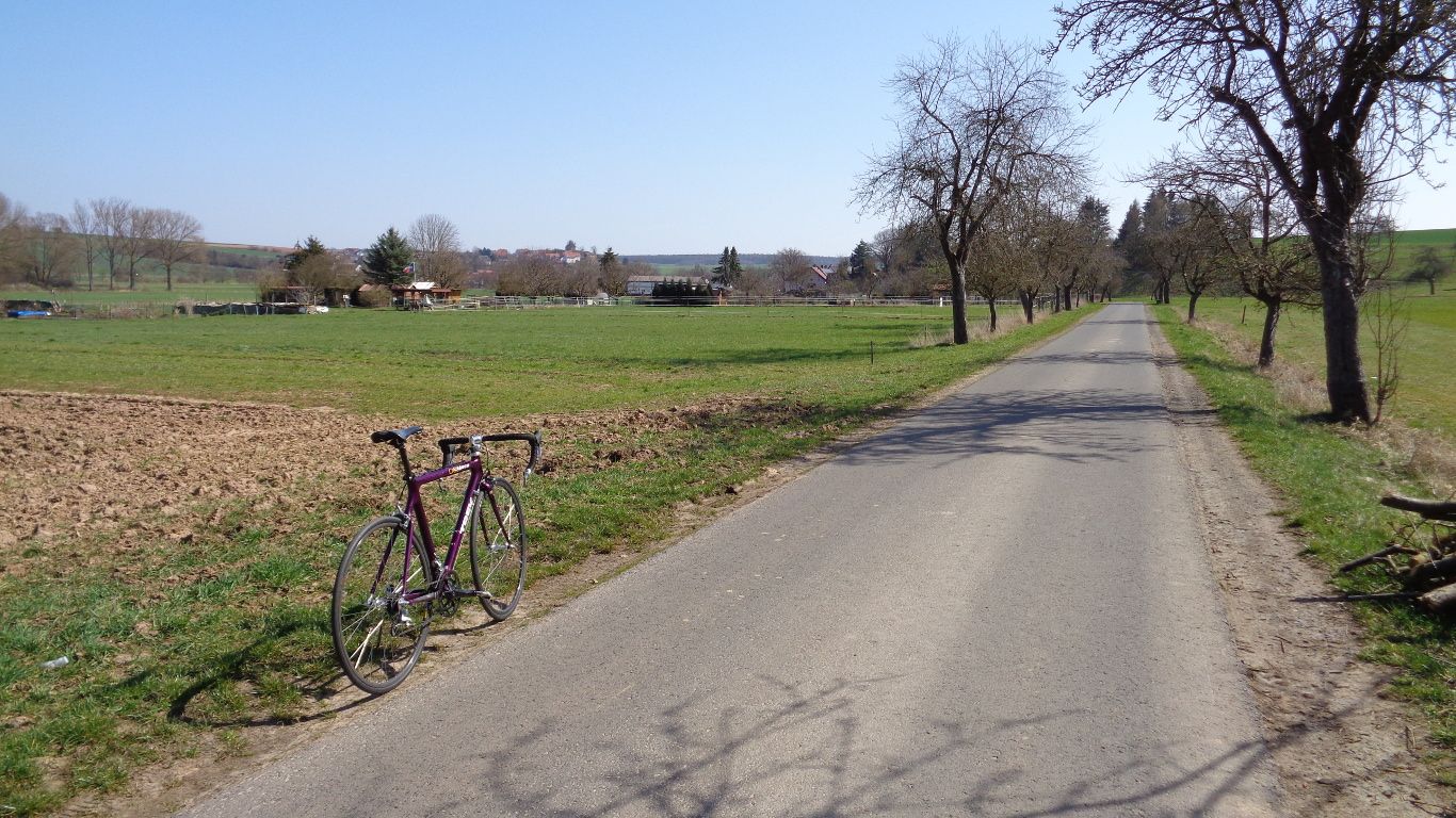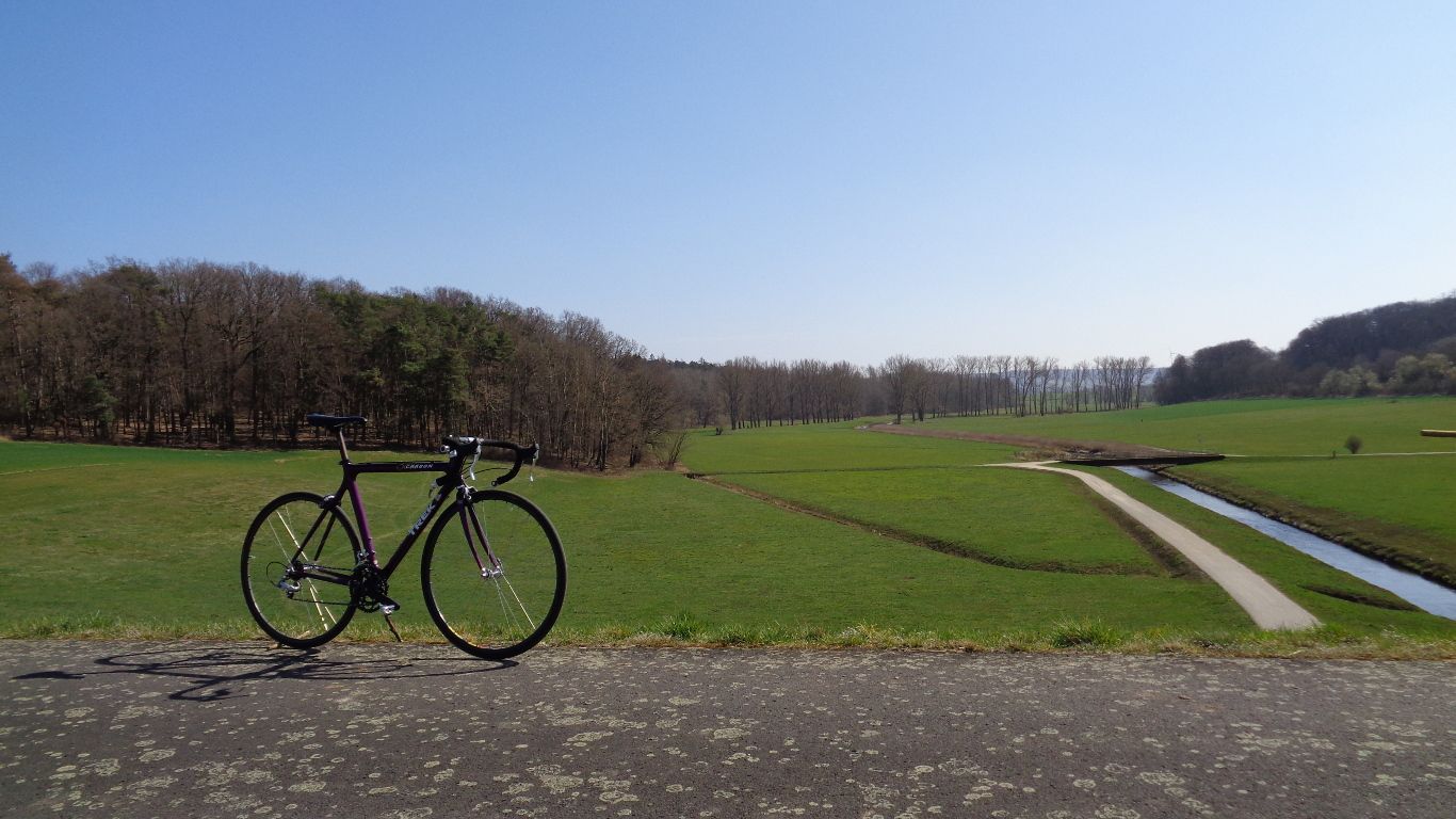 ...hinter den Büschen am rechen Bildrand weiter Richtung Münch-Leusel. Dann wurde es hügelig und die Geschwindigkeiten wandelten sich. Von 10km/h bergan bis 50km/h bergab war dann alles dabei. Und der Zweizylinder versuchte mit Drehmoment den Schnitt zu halten. Irgendwann ging aber nur noch runter schalten, auch mal auf's kleine Blatt. Und mit zusammen gebissenen Zähnen versuchen nicht unter einen 25er Schnitt zu fallen.