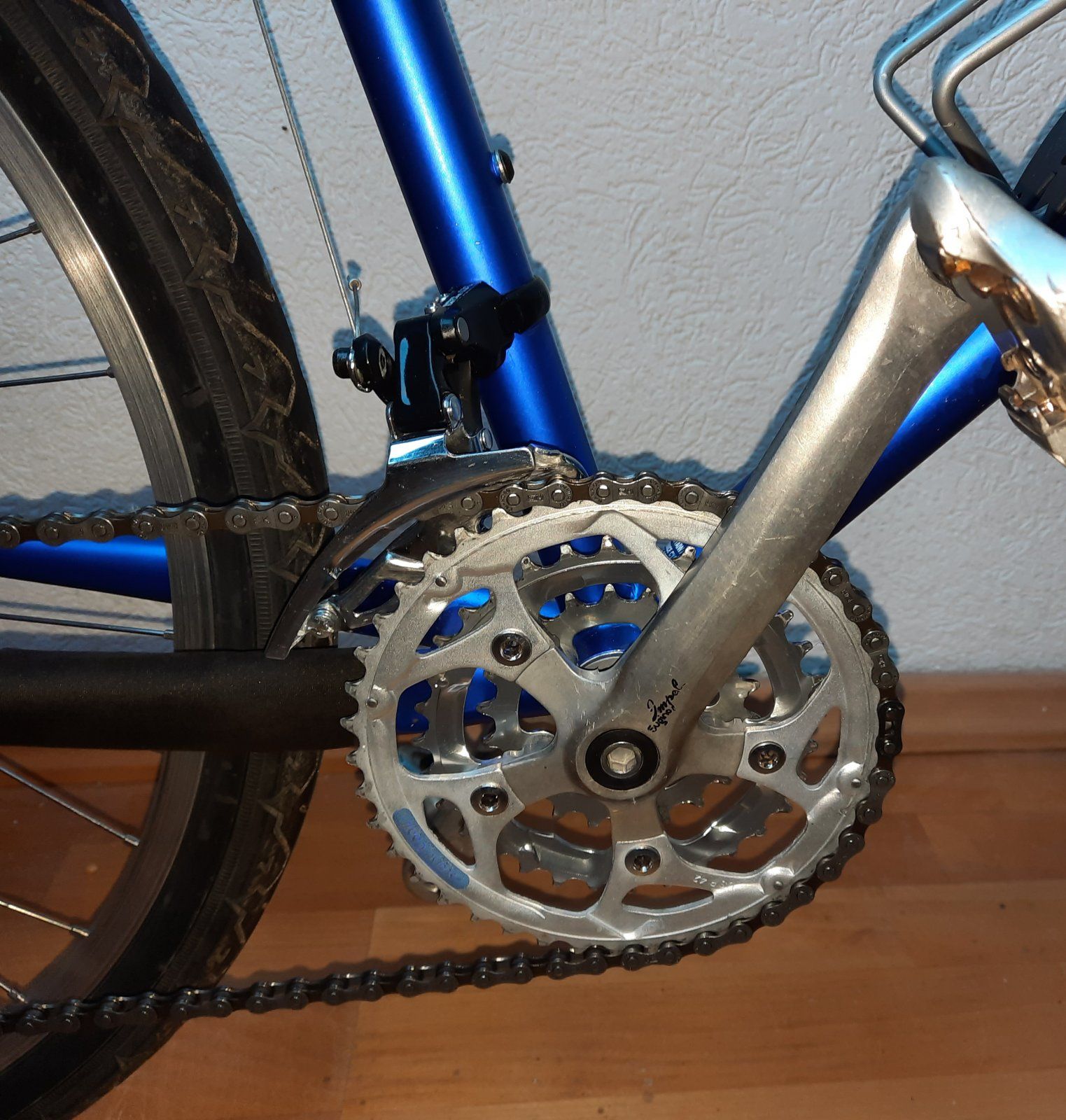 hier mein neues Altes. Vor drei Wochen in den Kleinanzeigen entdeckt, im Halbdunkel gekauft, dann geärgert, weil bei Lichte betrachtet wohl doch ein bisschen zu teuer, aber egal, drangemacht, alles auseinander gebaut, gesäubert (ich hab noch nie so eine Pampe in einem Schaltwerk gesehen), dann aber festgestellt, dass eigentlich, bis auf ein paar Stellen am Rahmen alles in echt gutem Zuststand war. Und: Bis auf das HR alles hundertpro Original.