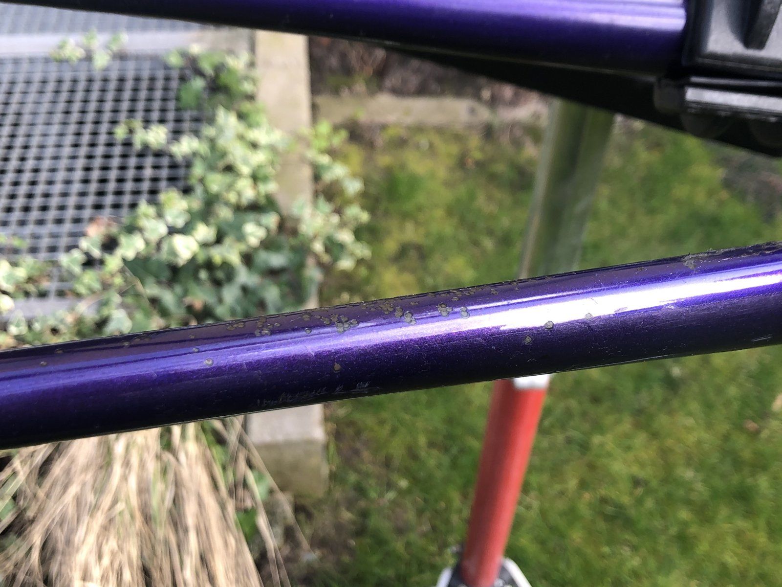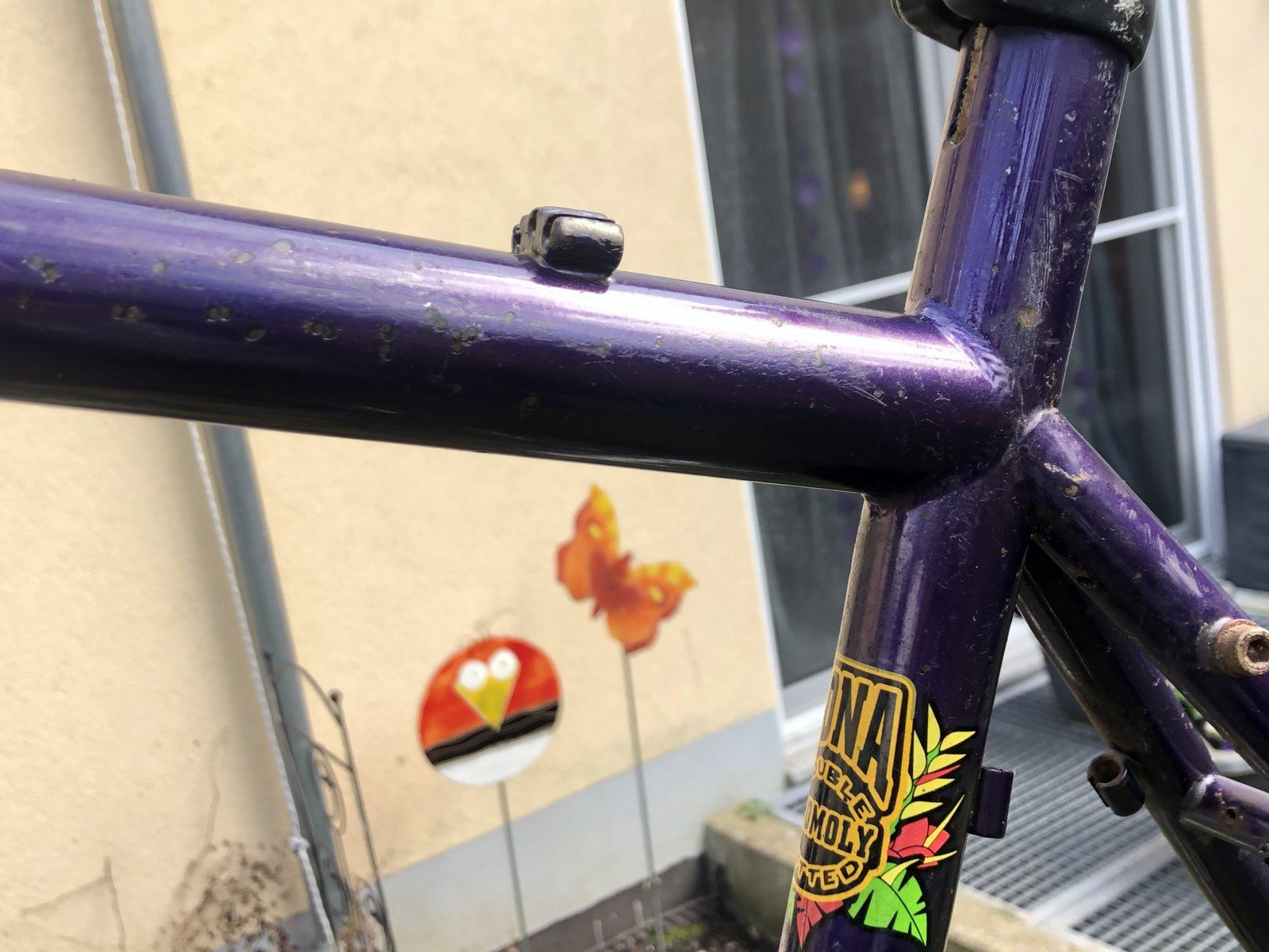 Traurig bin ich, weil Du einen solchen Rahmen wieder los werden willst. Ich hätte Dir empfohlen, mit Lackpolitur drüber zu gehen, das vollbringt oft Wunder. Die Farbbebung ist, find ich, der Knaller. Das Steuerkopfschild samt Lack ist ja noch fast intakt.