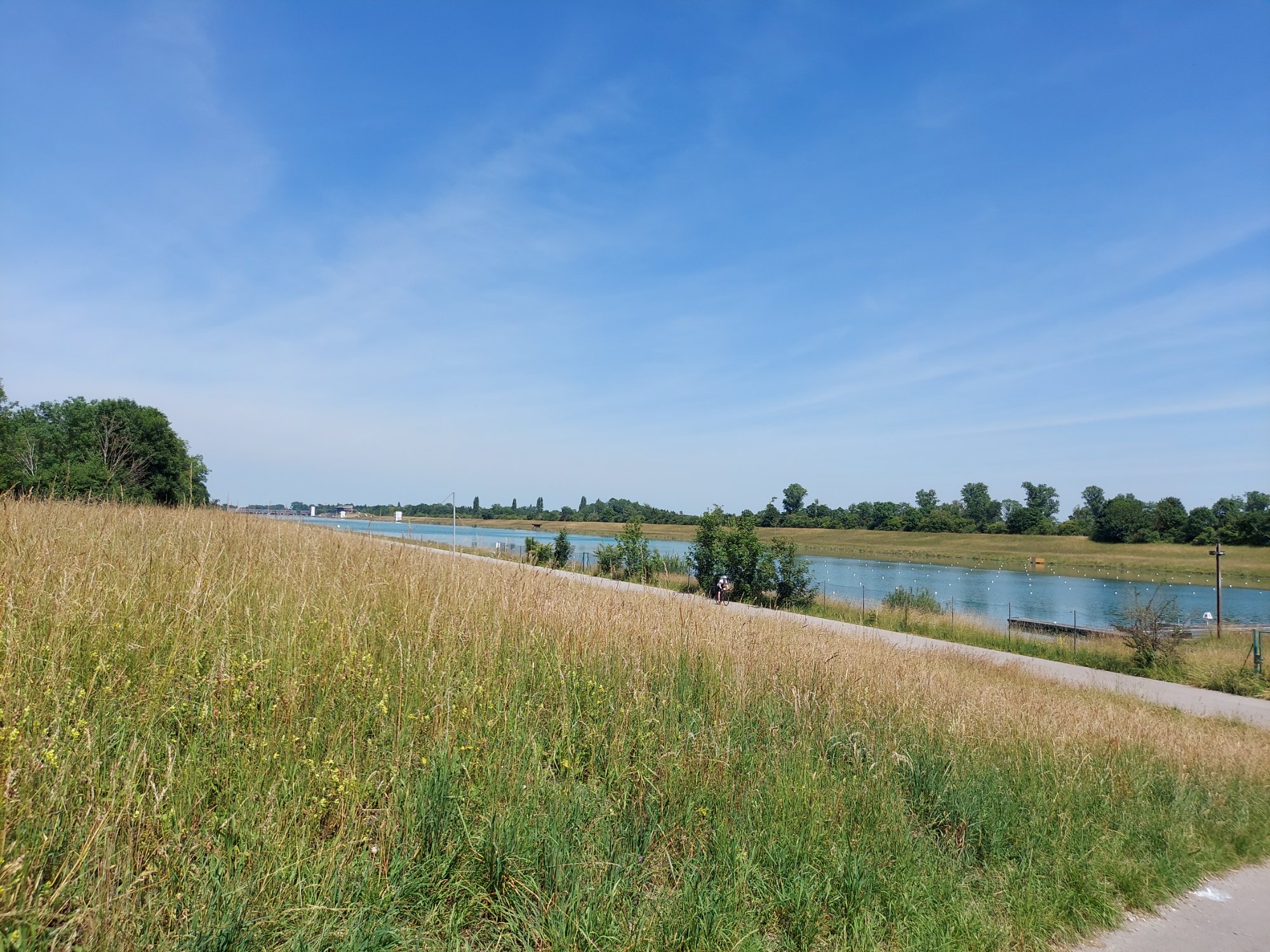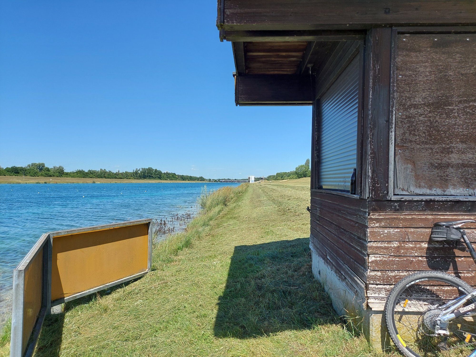 Nochmal westwärts zum Schleissheimer Schloss Biergarten dann südlich runter zum Flugfeld unter der Autobahn durch zurück südlich der Olympia Regattastrecke und im Beeregarten Rothschwaige noch Erdbeeren geholt. Gemütliche 30er Runde mit der komfortabel gefederten S Klasse. Staubige leichte Schotterwege überwiegen auch mit Schatten jetzt muss das Radl mal geputzt werden