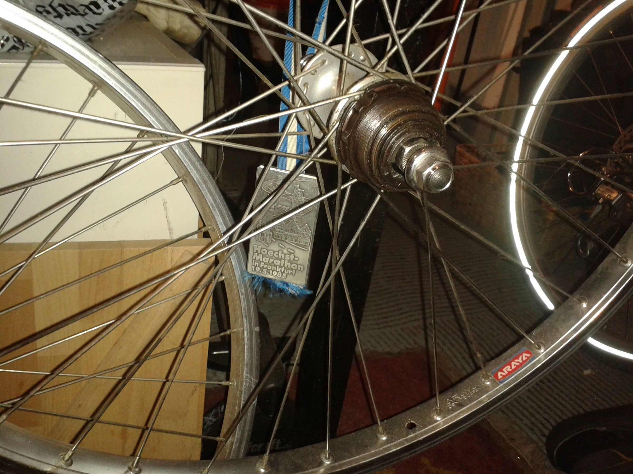 Das einzige was nicht original ist, sind die von mir nachgerüsteten Laufräder mit Shimano LX Naben und Shimano 7fach Kassette. Eigentlich gehören da Suntour Naben mit Rillenkugellagern in Araya-Felgen (hinten vierfach gekreuzt) rein. Die sind auch noch da und in prima Zustand: