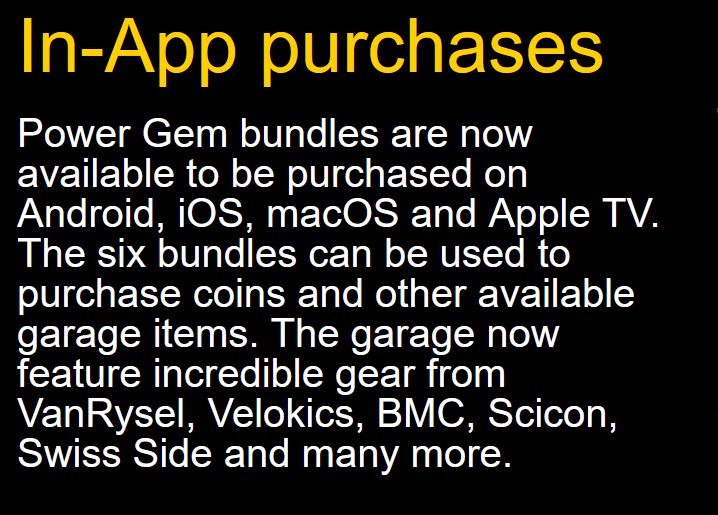 Könnte mir halt vorstellen, dass es so läuft wie bei den meisten handyspielen. Grundsätzlich kann man gratis fahren, wer aber schnell die besten Bikes oder irgendwelche Videos freischalten will, muss dann mit Coins bezahlen.Mag schon sein, heuer wurde ja eingeführt dass man sich mit Coins gegen Ausrüstung tauschen kann. Ich denke aber doch, dass in den nächsten 2,5 Jahren hin zum voraussichtlichen Ende mit der UCI Partnerschaft versucht wird auch von den Nutzern einen Obolus in irgendeiner Form einzutreiben. Die letzten Releases lassen das an der einen oder anderen Ecke wohl schon erkennen. Ganz ohne finanziellen Hintergedanken wurden die "Features" sicher nicht eingeführt, das riecht mir schon eher nach einem Plan.