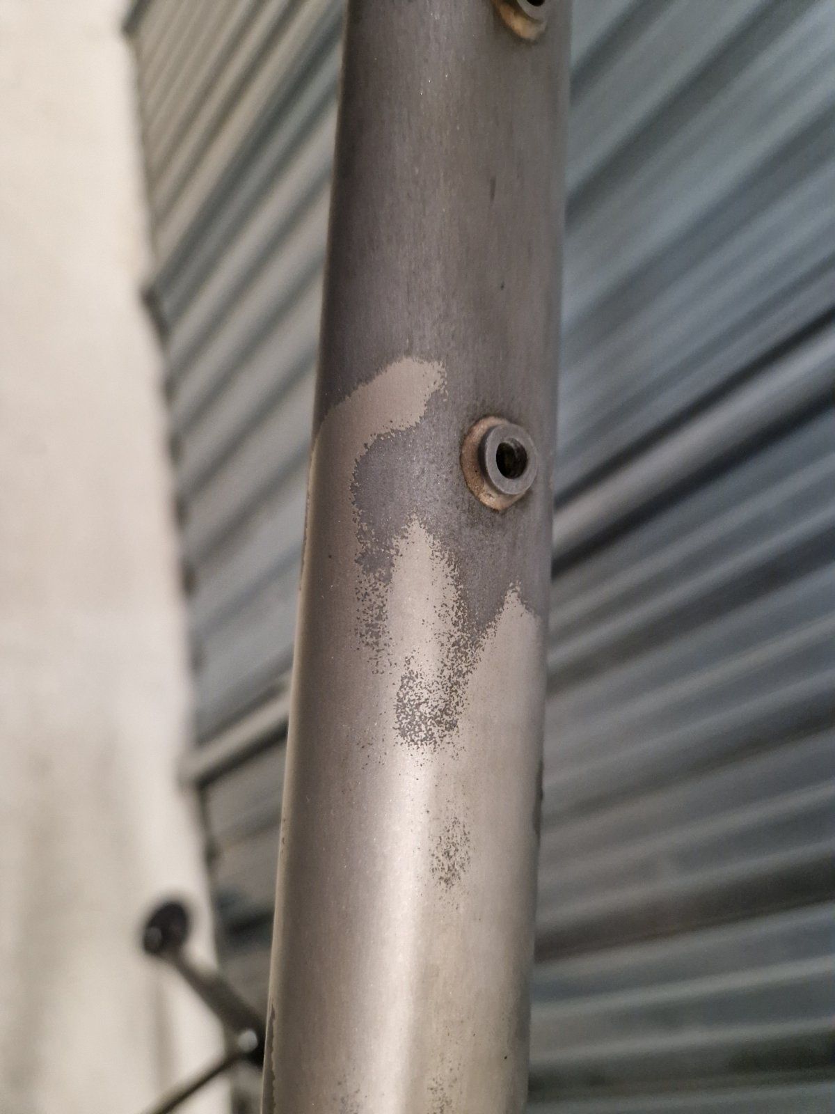 Wie zu sehen, war es recht verbastelt. Die Anbauteile habe ich zur Refinanzierung verwendet, denn ich werde nur das Rahmenset für meinen Aufbau nutzen. Der Rahmen ist leider nachträglich pulverbeschichtet und mit zu jungen Herkelmann-Decals versehen worden. Daher fällt die Wahl auf Entfernen der Beschichtung und Neulack. Der Rahmen soll im Volvo Farbton Fusion Red lackiert werden. Hier in Hamburg bietet sich die Lackierung bei H. Wechsel an, der ja hier mit Suicycle zusammenarbeitet.