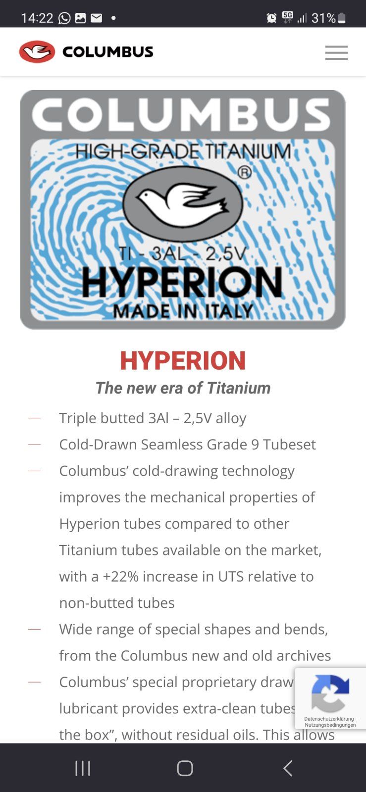 Mach doch mal bitte ein Foto vom COLUMBUS Rohrsticker. Das kenne ich von Titanrahmen gar nicht. Die meisten Rahmen - wenn nicht aus amerikanischer Produktion - sind ja aus Material russischer Herkunft „gebrutzelt“, oftmals von Firmen deren Haupteinnahme nicht der Fahrrad-Rahmenbau ist/war. Auch das Rohmaterial, also die Rohre, kamen dann eher von Zulieferern der Rüstungsindustrie, meine ich. Ich wußte bisher gar nicht, dass COLUMBUS einen Titan-Rohrsatz im Portfolio hat oder hatte…