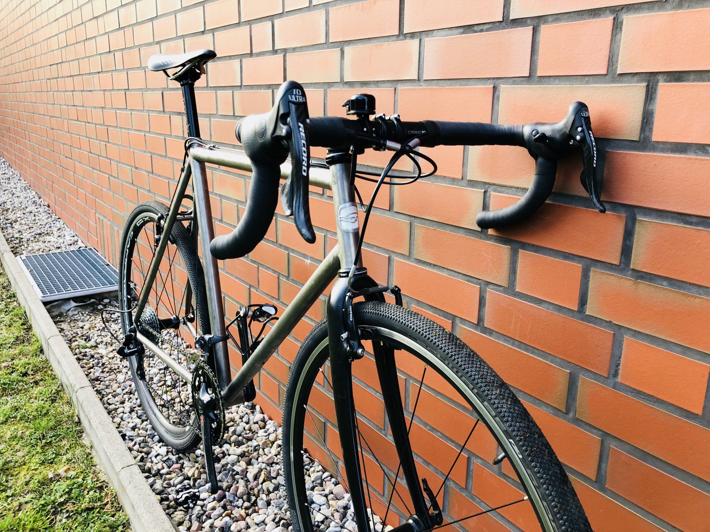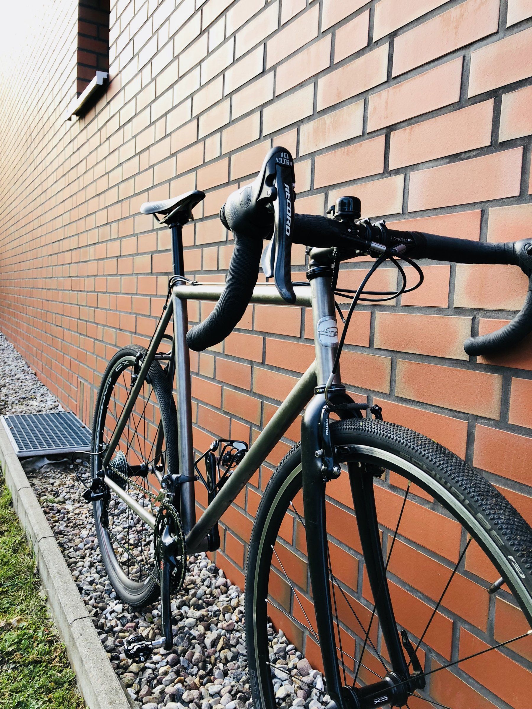 Das gezeigte Rad ist ein Van Tuyl Titan-Crosser mit Carbongabel, aufgebaut mit einer halbwegs modernen Campa 10fach Schaltung und allerlei Komponenten-Mix. Die billigen Tektro 916 AL Bremsen sind zuverlässig, die Schwalbe G-One gefallen mir, rollen als Faltreifen sehr gut. Das Lenkerband ist ein Lizardskin-Imitat von Rose. Kostet die Hälfte und ist sehr komfortabel und griffig.
