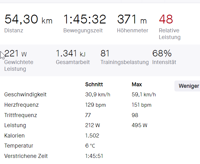 Bei Bekannten auf Strava sehe ich manchmal, das der Puls über der Leistung liegt, natürlich etwas höher so im 130er Bereich...