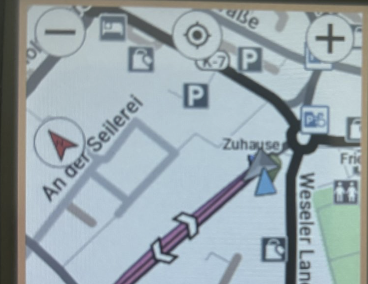 --- seit Generationen unveränderbare magenta-Linie und der kleiner schwarze Richtungs-Pfeil, der FÜR MICH nicht mehr sichtbar und leider nicht konfigurierbar ist (Karoo fette gelbe Linie und Pfeil sehr sichtbar)
