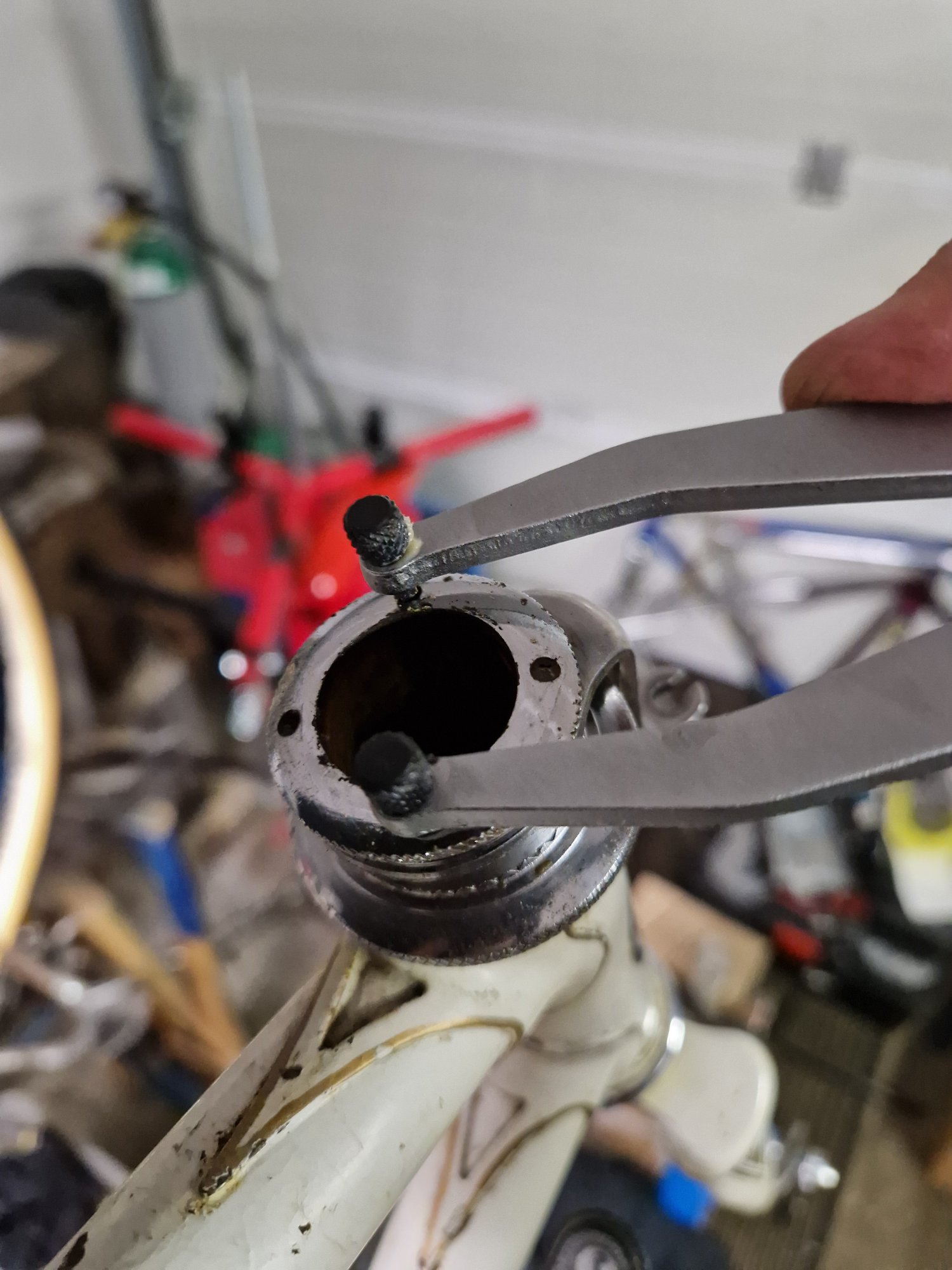 Dann habe ich den schönen Stronglight Steuersatz ausgebaut, wo wieder mein schönes Stiftwerkzeug zum Einsatz kam