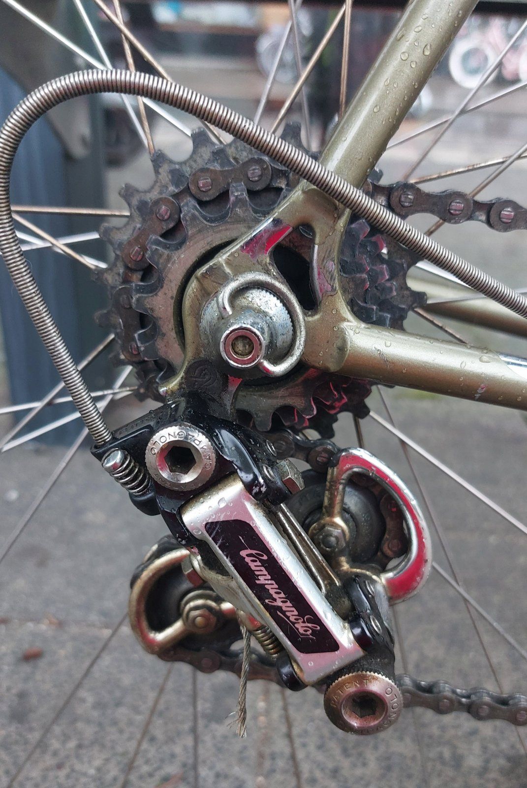 Laufräder: Es war garnicht so einfach, überhaupt welche mit passender Einbaubreite (120 mm hinten) zu finden! Es sind zeitlich passende Shimano-Naben mit Felgen von Mavic „Championnat du monde sur route“ geworden (also Schauchreifen). Eine passende Fünffachkassette (Gran Compe) war schon dran! Ursprünglich waren offenbar mal Araya-Felgen (wie von @DaRav vorgeschlagen!) & Schlauchreifen verbaut (zumindest das passt also).