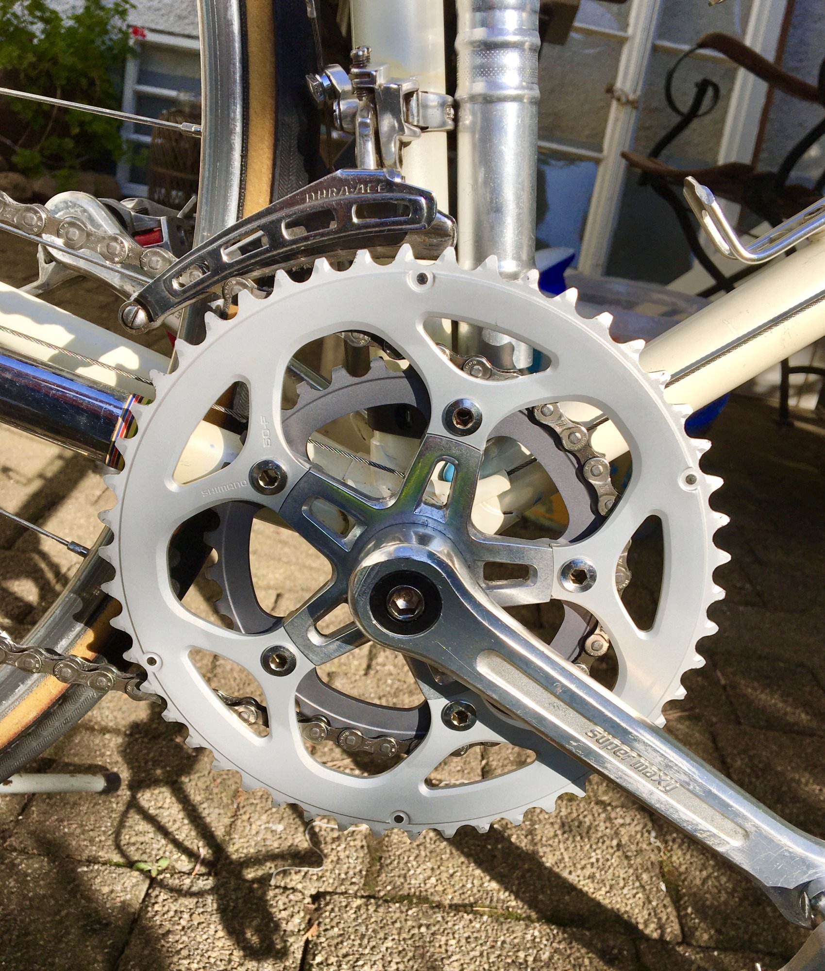 @RoKaDo hatte ich diese Woche ein Gespräch, warum das Rad nicht groß-groß schalten mag. Da ich die Biopace Blätter nicht so schlecht finde (bzw. mich stört an der Traveller nur das kleine, hier ist das kleine jedoch ein Rundes und damit komme ich gut klar), können sie eigentlich bleiben, daher ist es sicher nicht verkehrt die Schaltung besser einzustellen. Meine Theorie war ja, dass hinten 8fach mit 130 EB und vorne Kettenlinie mit 47,5 sich beißen. Daher habe ich jetzt statt des Innenlagers mit 122,5 eins mit 118 verbaut. Die Kettenlinie ist nun kleiner und so schaltet es sauber in alle Gänge