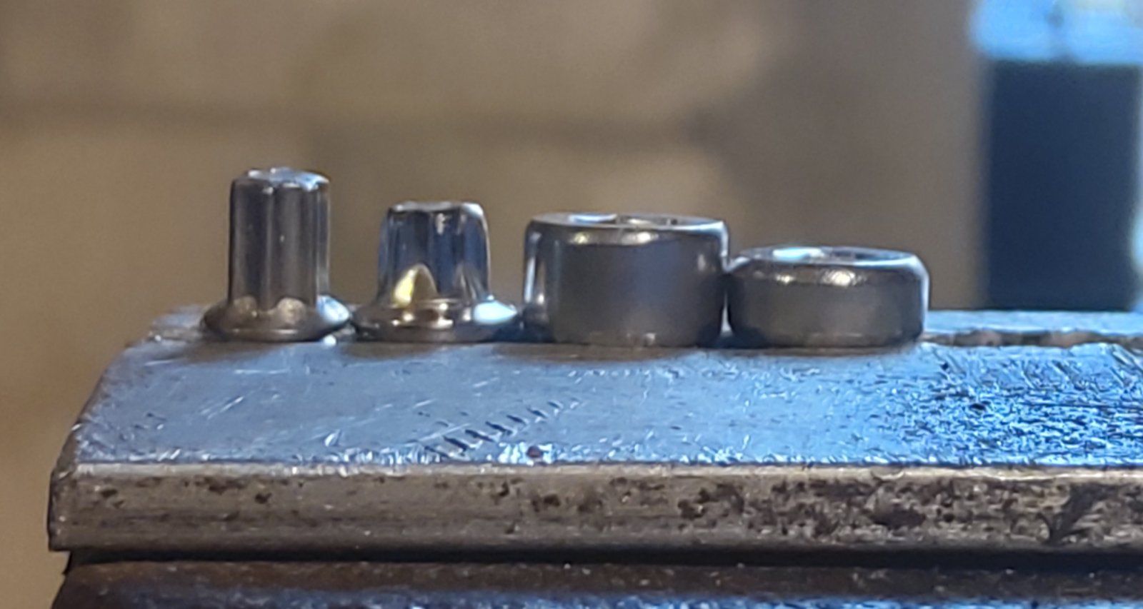Links Original, 5mm hoch, dann VO, 4,2mm, dann Inbus Zylinderkopf 3,8mm und 2,8mm