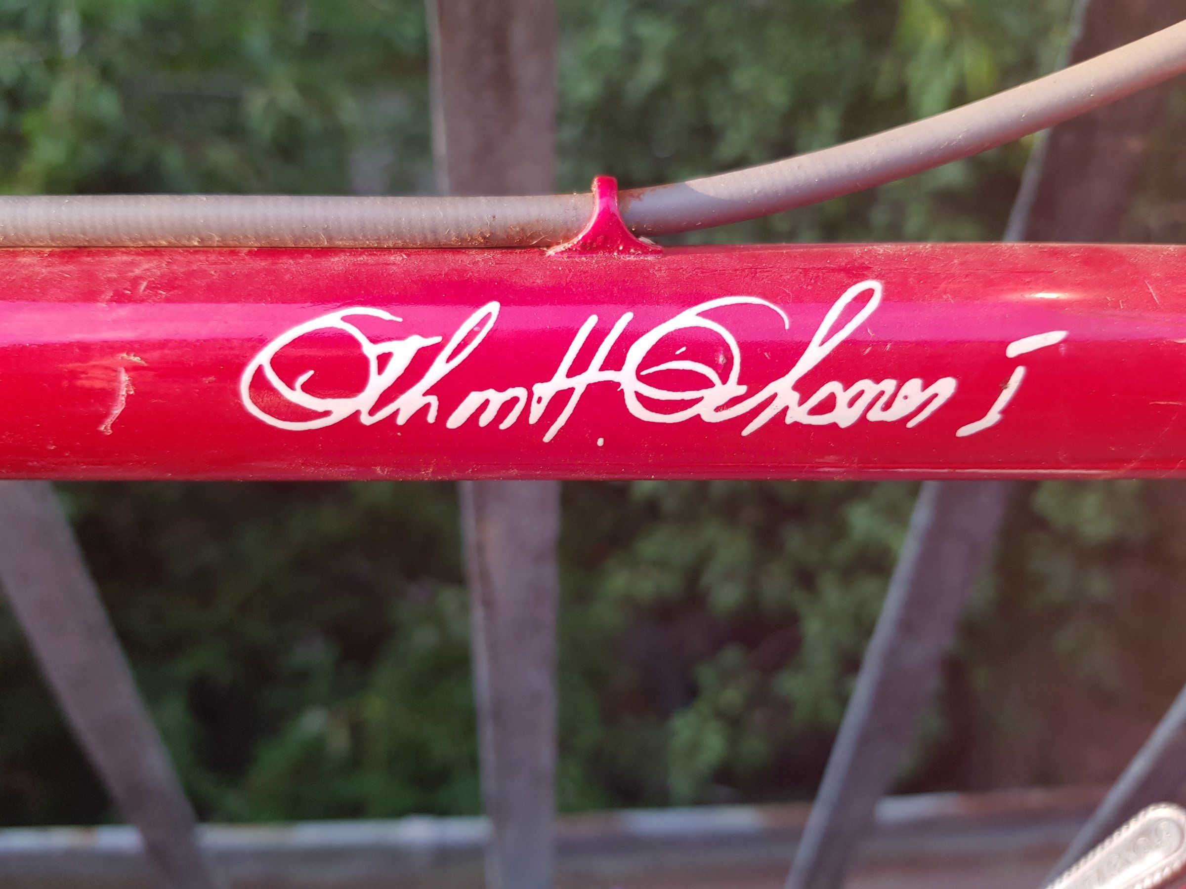 Hallo zusammen....nicht nur das ich das RR gestern gefunden habe. Heute schon. gezahlt und abgeholt. Rahmen passt und fährt sich super. Campa GS anscheinend komplett. Kann mir jemand was zum Rahmen sagen. Das Rad war wohl der Renner eines Kategorie 2 Fahrers. Der Name steht am Oberrohr. Danke ds