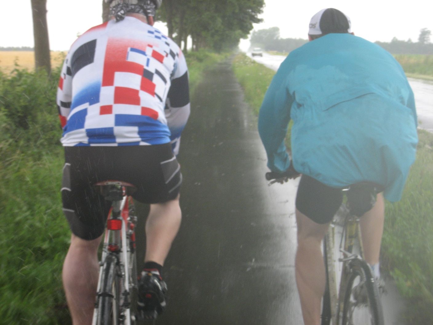 Der Clou ist: wir hatten im letzten Jahr bei jeder Tour Glück mit dem Wetter. Selbst wenn die Prognosen Dauerregen vorhersagten, war es letztenendes trocken. Regen gab's dann ungefähr 300m vorm Ziel. In diesem Jahr haben wir unsere Klappe wohl zu weit aufgerissen, was das gute Wetter anging. Prompt gibt's Regen. Wobei ich jetzt nicht so vermessen bin, den bisherigen nassen "Sommer" nur auf Klassikerevents zu schieben...